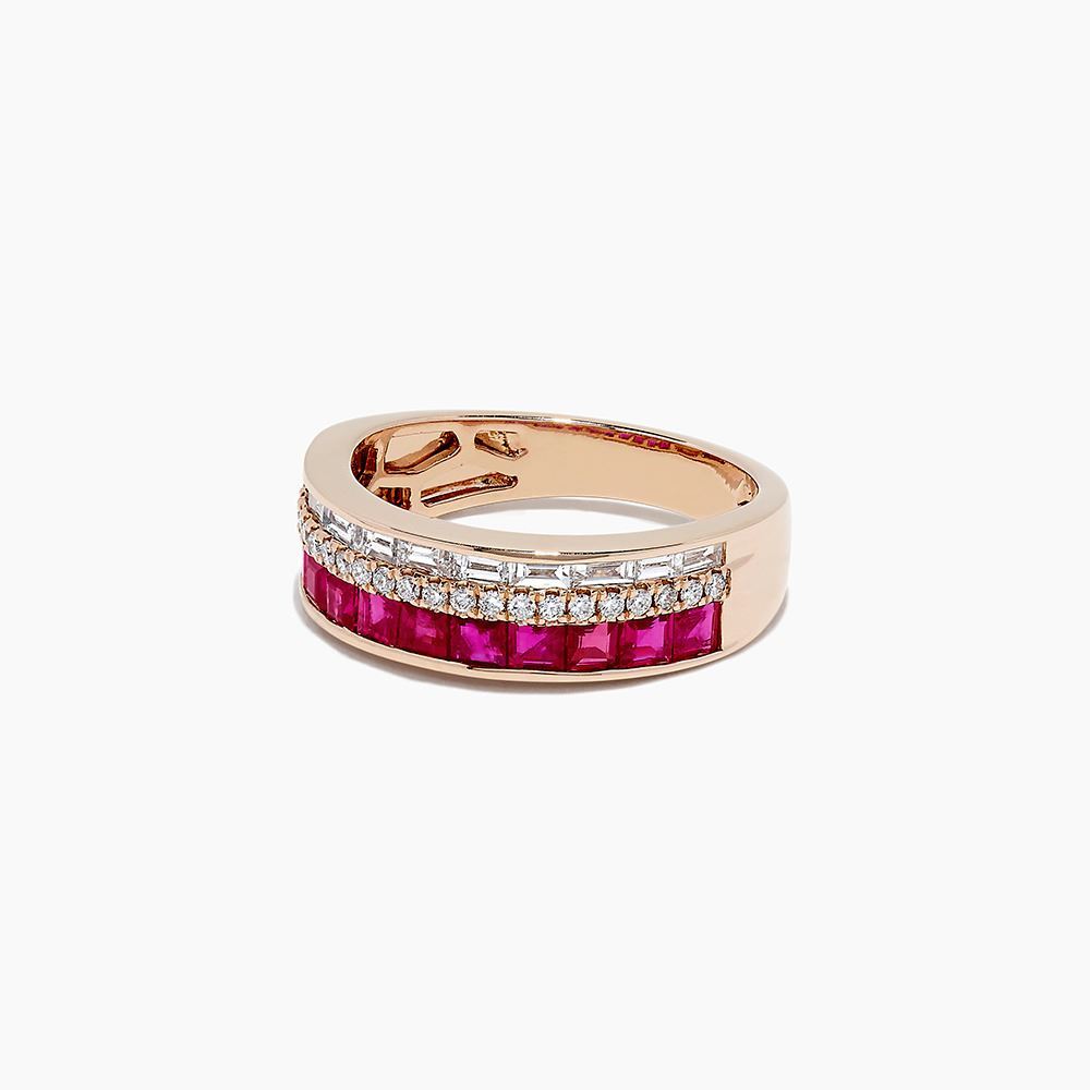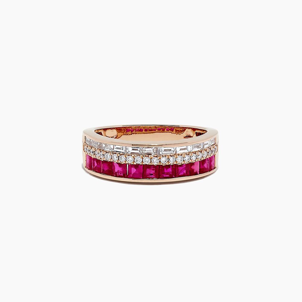 Where practicality meets colorful perfection. A design expansion inspired by a traditional channel set ring. The designers have artistically matched two different cuts of diamonds with the warmth of vibrant rubies in a sleek rose gold setting.