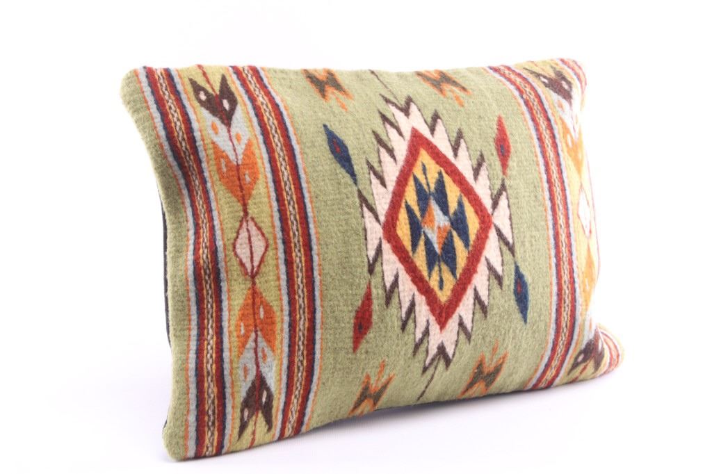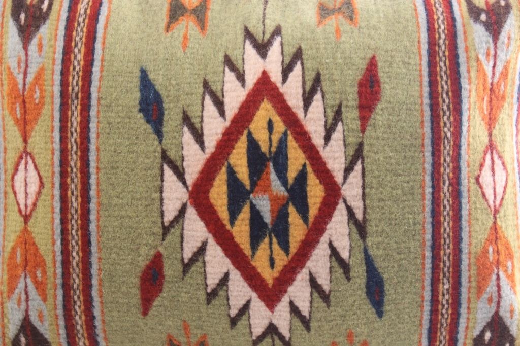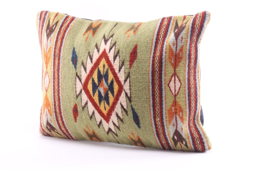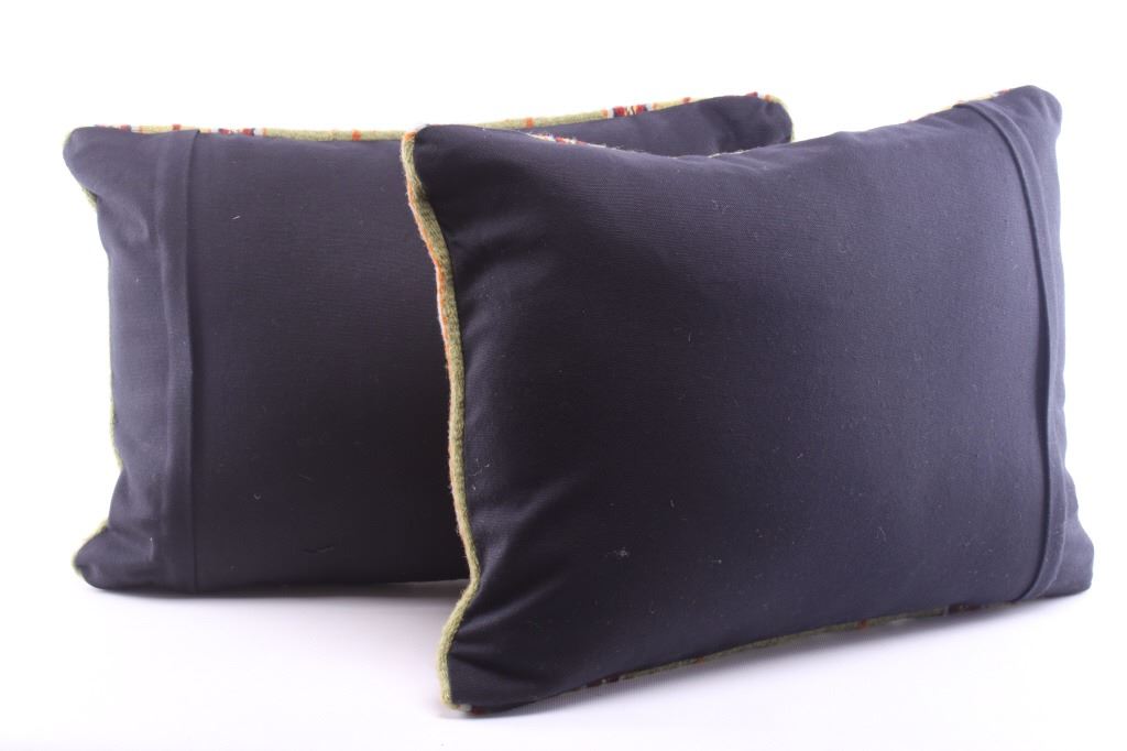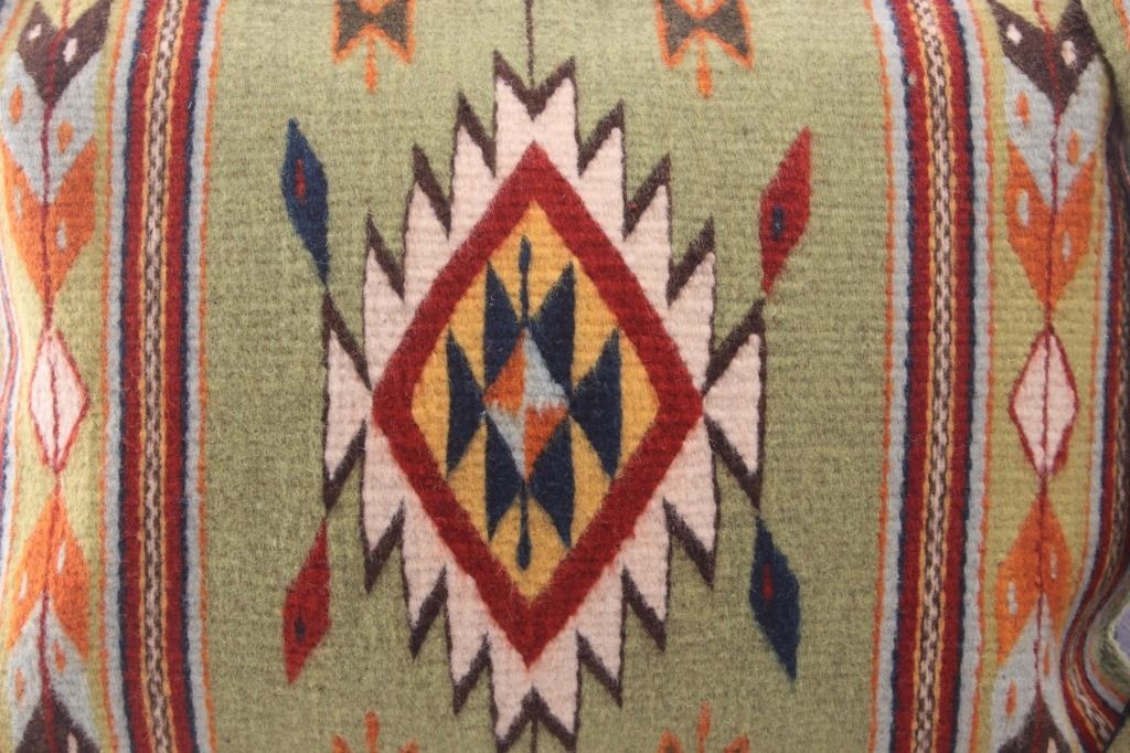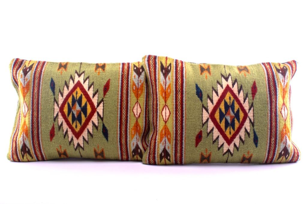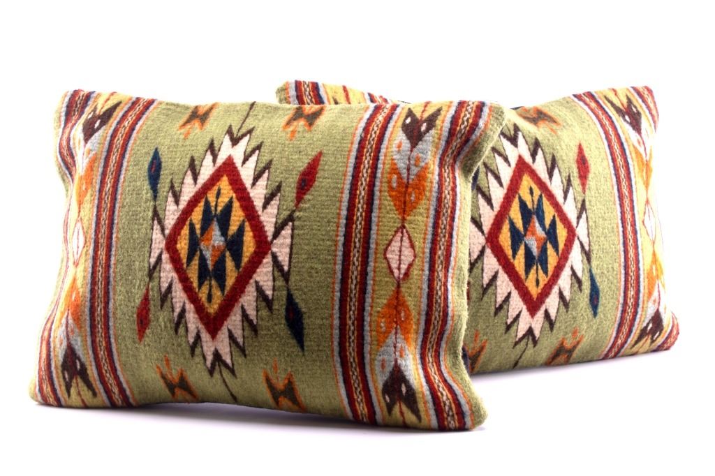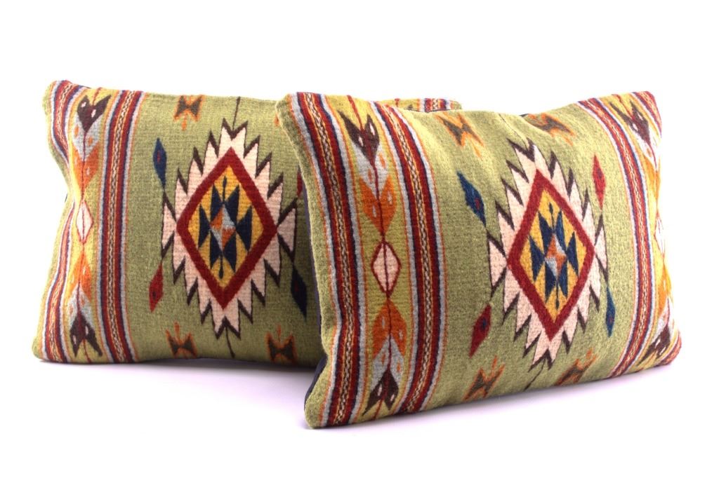 The lot features an excellent set of two hand woven, flat weave pillows by master weaver Efrain Gonzalez. The pillows were made using 100% soft, fine, Churro wool yarns. Churro wool is a time-tested fiber that is strong and soft and provides a vibrant base for colors. The tight, hand woven weave shows rich colors in the fine Efrain's Diamante pattern of the time-honored Zapotec, multi-generational craft by a master weaver, Efrain Gonzalez. The set is in brand new condition and is made with a pre-shrunk cotton backing with a zipper. Pillow inserts are included. Each pillow is 14 1/2” x 18 1/2” and approximately 6.5” deep. The pillows are stiff, square supportive pillows. The lot includes the set of two pillows and two pillow inserts in brand new condition.