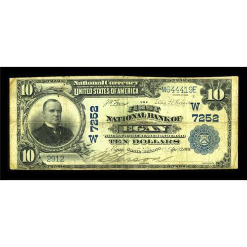 <B>Egan, SD</B></I> - $10 1902 Plain Back Fr. 624 <B>The First NB</B></I> Ch. # (W)7252<BR> This Moody County issuer was the only bank in town and had a modest issue of more than $320,000. This piece retains the cashier's signature and decent eye appeal. There are some flecks of rust that are noted, but are not overbearing. <B>Fine.<BR></B></I><I>From The Walla Walla Collection</B></I><BR><BR><b>Shipping:</b> Coins & Currency (<a target="_blank" href="http://www.heritageauctions.com/common/shipping.php">view shipping information</a>)