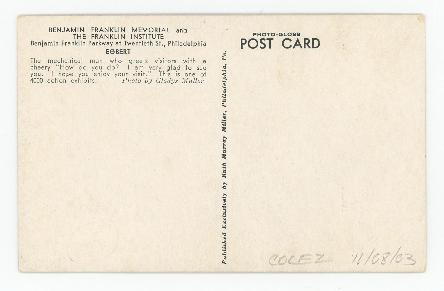 Photo by Gladys Muller. Philadelphia, Pennsylvania. Photo depicts Egbert, the mechanical greeter robot at the Franklin Institute.