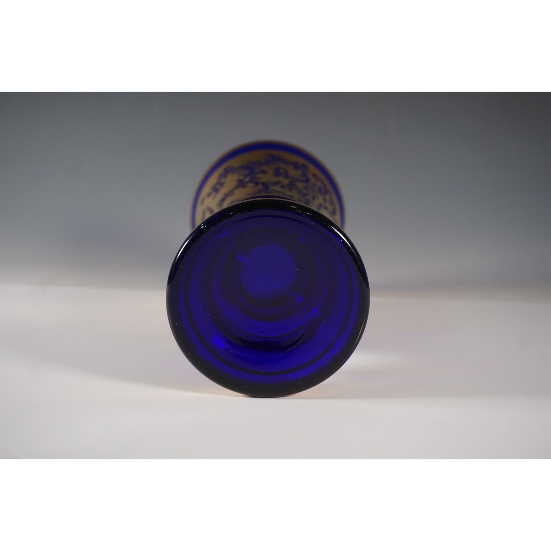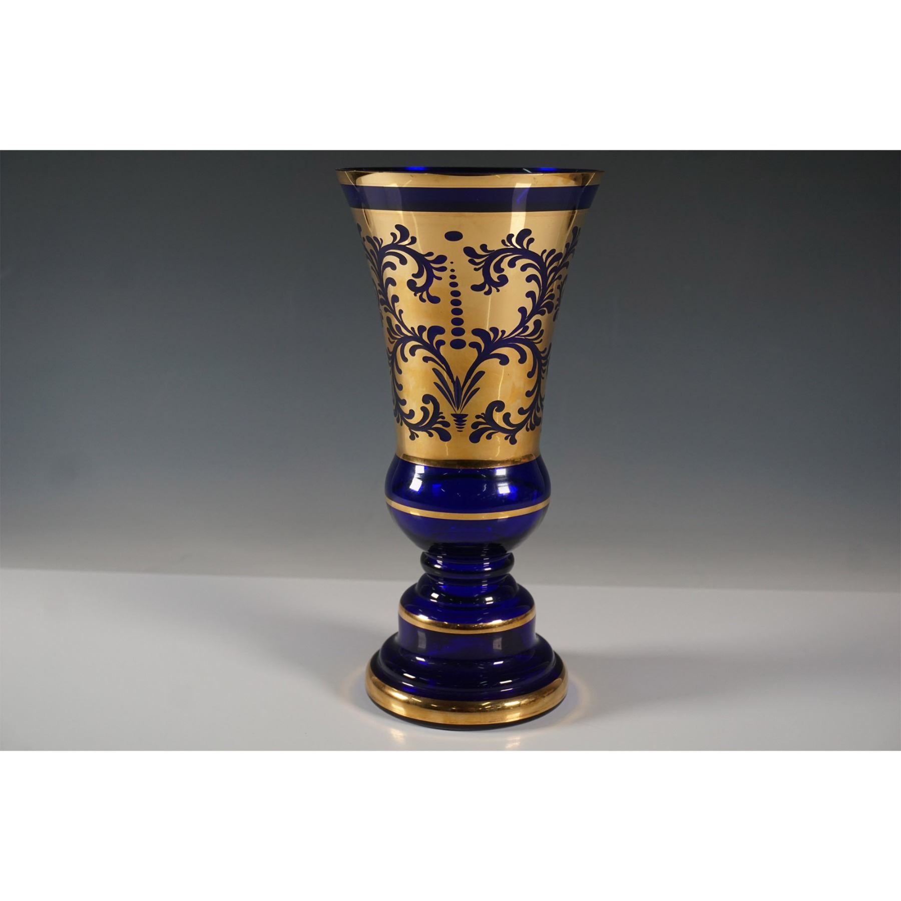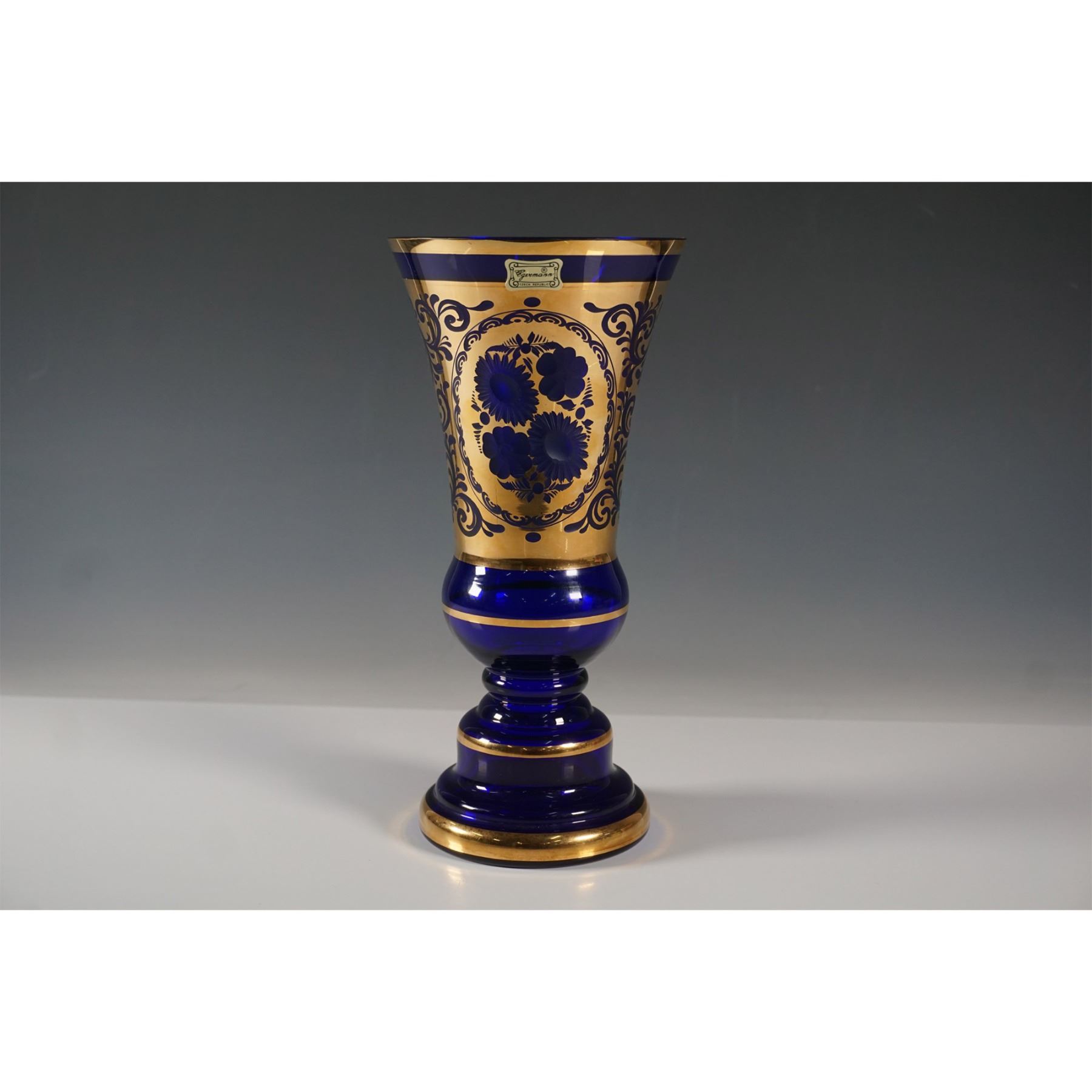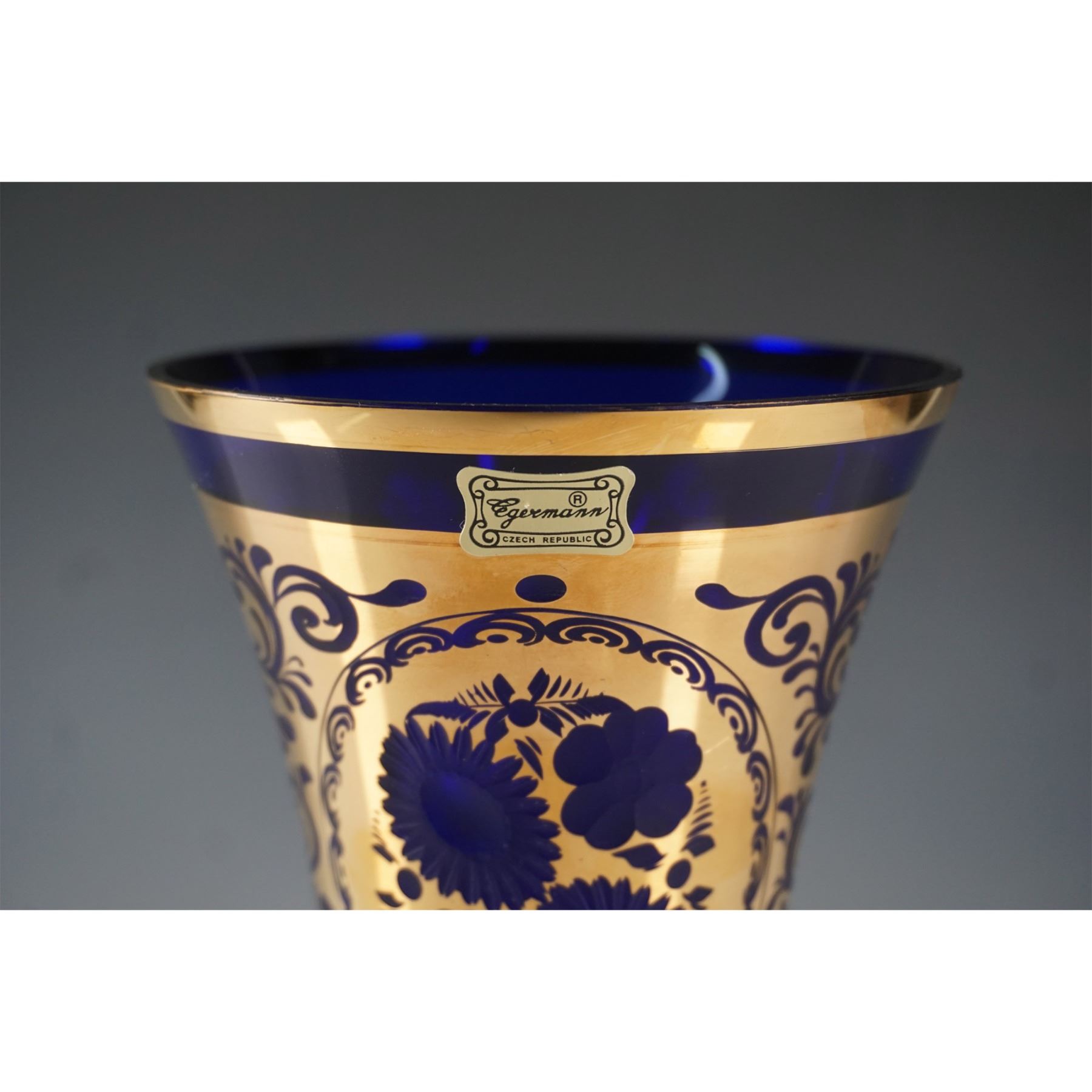 This elegant Egermann Bohemian glass vase features a rich cobalt blue body, adorned with intricate gold floral accents. The upper portion of the vase is decorated with ornate floral patterns, while gold bands highlight the base. The piece is marked with an Egermann label, showcasing its Czech origin and the quality craftsmanship for which Egermann is renowned. The deep blue color and gilded design create a striking visual contrast, making this vase a standout piece for any collection.