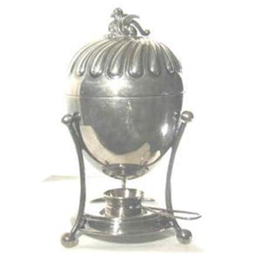 Used on the sideboard or breakfast table to keep soft boiled eggs warm. A winged griffon decorates the top. The inside has a removable holder for 4 eggs the holder has 4 feet and it sits on a ledge that runs around the inside of the base. The base was filled with hot water and a small candle was lighted underneath to keep the water warm and the eggs warm too. Elegant heavy silver plate 2lbs in weight.