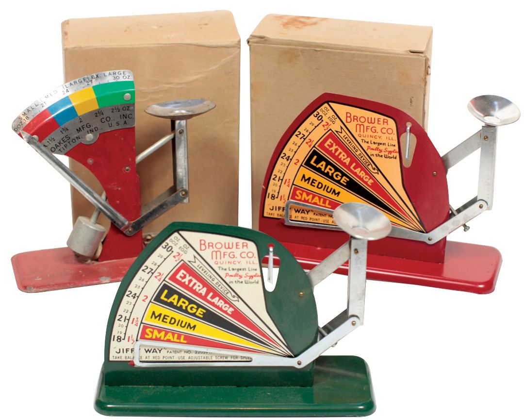 Egg scales (3), 2 NOS in orig boxes, Brower Mfg Co.-Quincy, IL & 1 Oakes Mfg Co-Tipton, IN, VG cond, 6"H x 7.5"W.