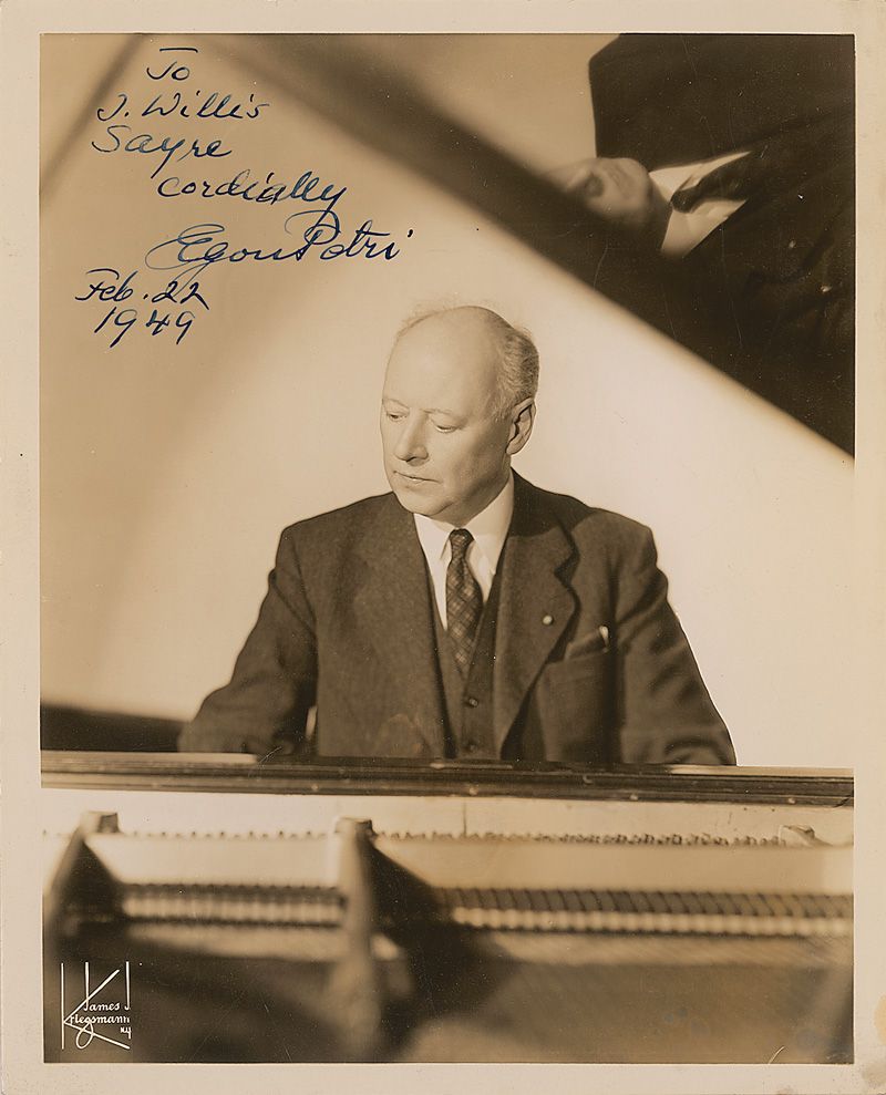 Influential classical pianist (1881-1962) whose repertoire focused on Bach, Liszt, Beethoven, and Brahms. He escaped from Poland the day before Germany invaded in 1939 and moved to the United States. Although he was born in Germany and spent his youth in Dresden, Petri refused to perform there ever again. Vintage glossy 8 x 10 photo of Petri at the piano, signed and inscribed in fountain pen “To J. Willis Sayre, cordially, Egon Petri, Feb. 22 1949.” In fine condition, with scattered surface marks and creases, and light soiling to the lower right corner.