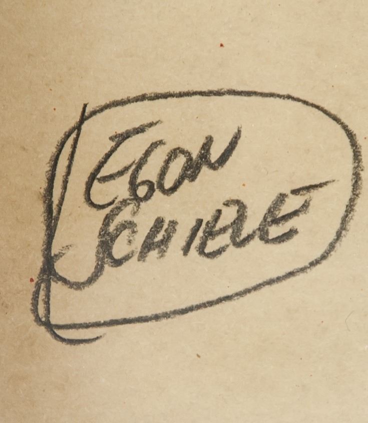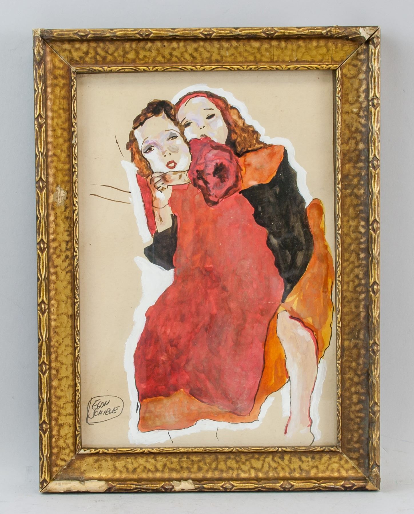 Gouache on paper, framed. Featuring two figures. Signed Egon Schiele on the lower left corner. Attributed to Egon Schiele (1890-1918, Austrian). 28 x 19 cm (11 x 7.5 in). PROVENANCE: Southern Ontario estate