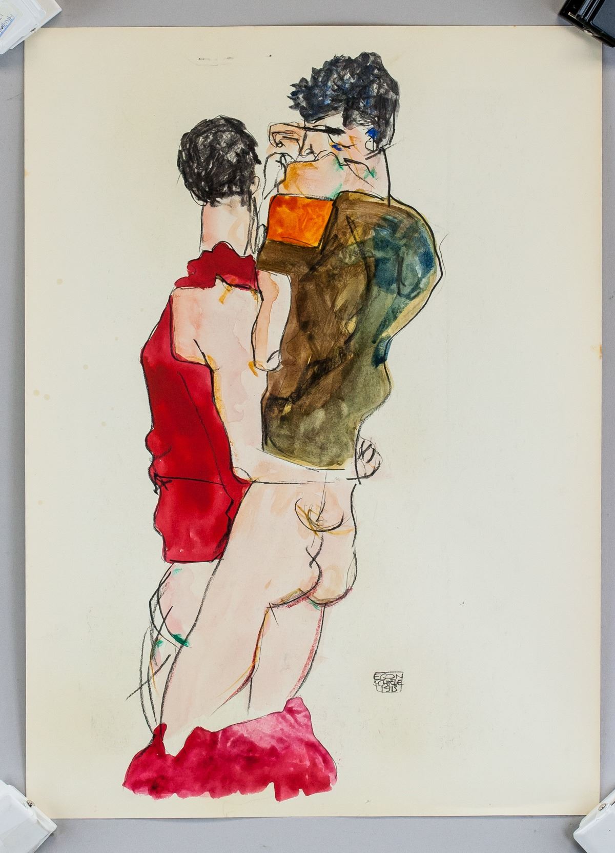 Mixed media on paper with printed image of Bibliotheque De L'Hotel Cornudet on the verso. Featuring two couples. Signed EGON SCHIELE 1913 on the lower right corner 17.25 x 12.25 inches (43.8 x 31.2 cm). PROVENANCE: Private estate (Perugia, Italy)