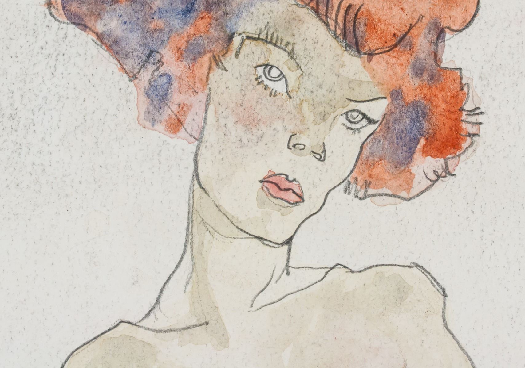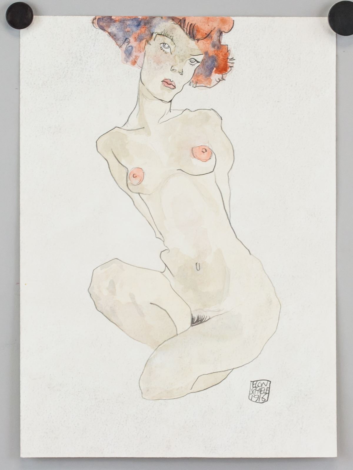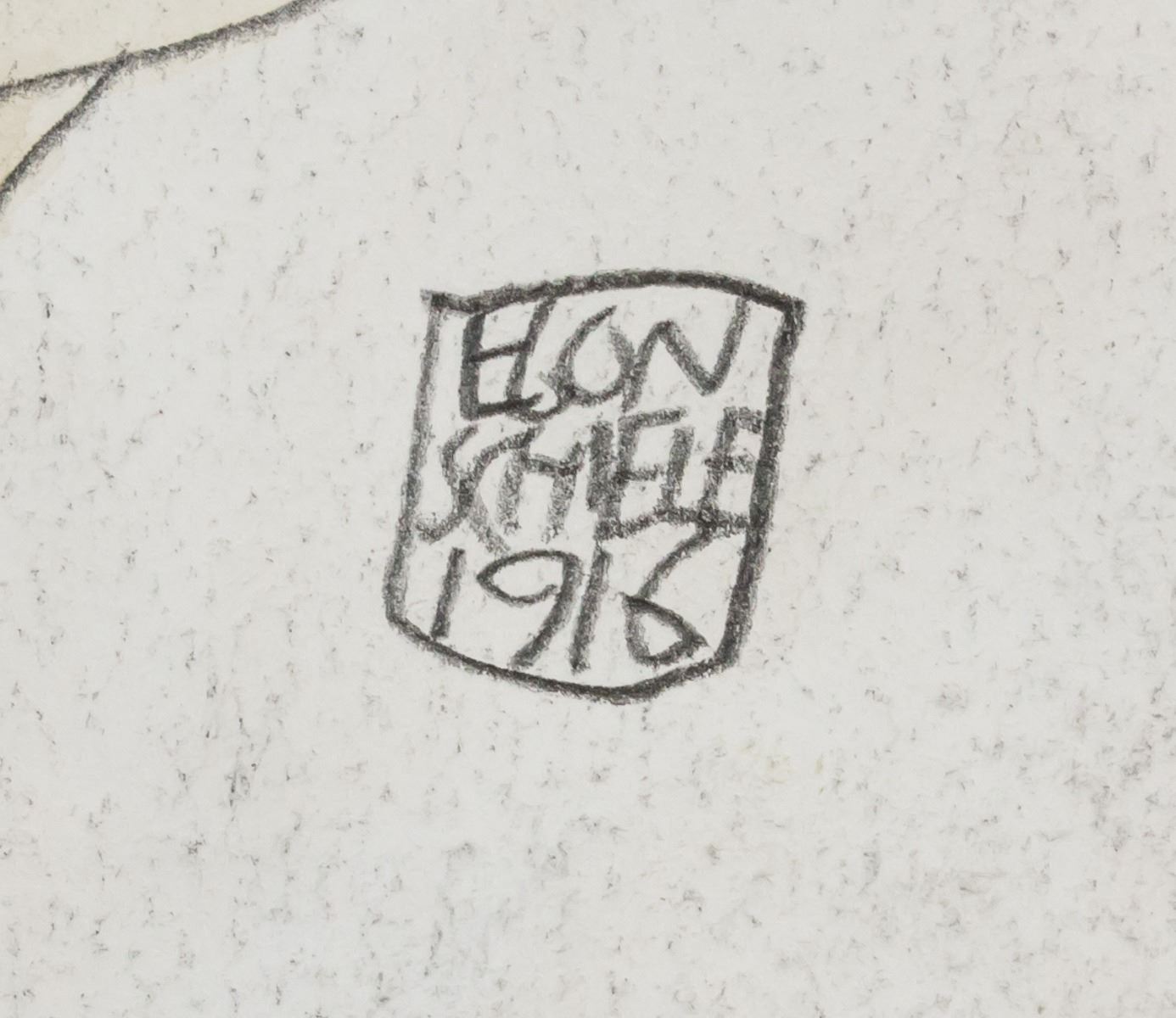 Mixed media on paper. Featuring a nude woman. Signed EGON SCHIELE and inscribed 1916 on the lower right corner. Stamped illegibly on verso. Another stamp inscribed 16. Attributed to Egon Schiele (1890-1918, Austrian). 31 x 23 cm (12 x 8.5 inches). PROVENANCE: This item has limited provenance from a Private European collection