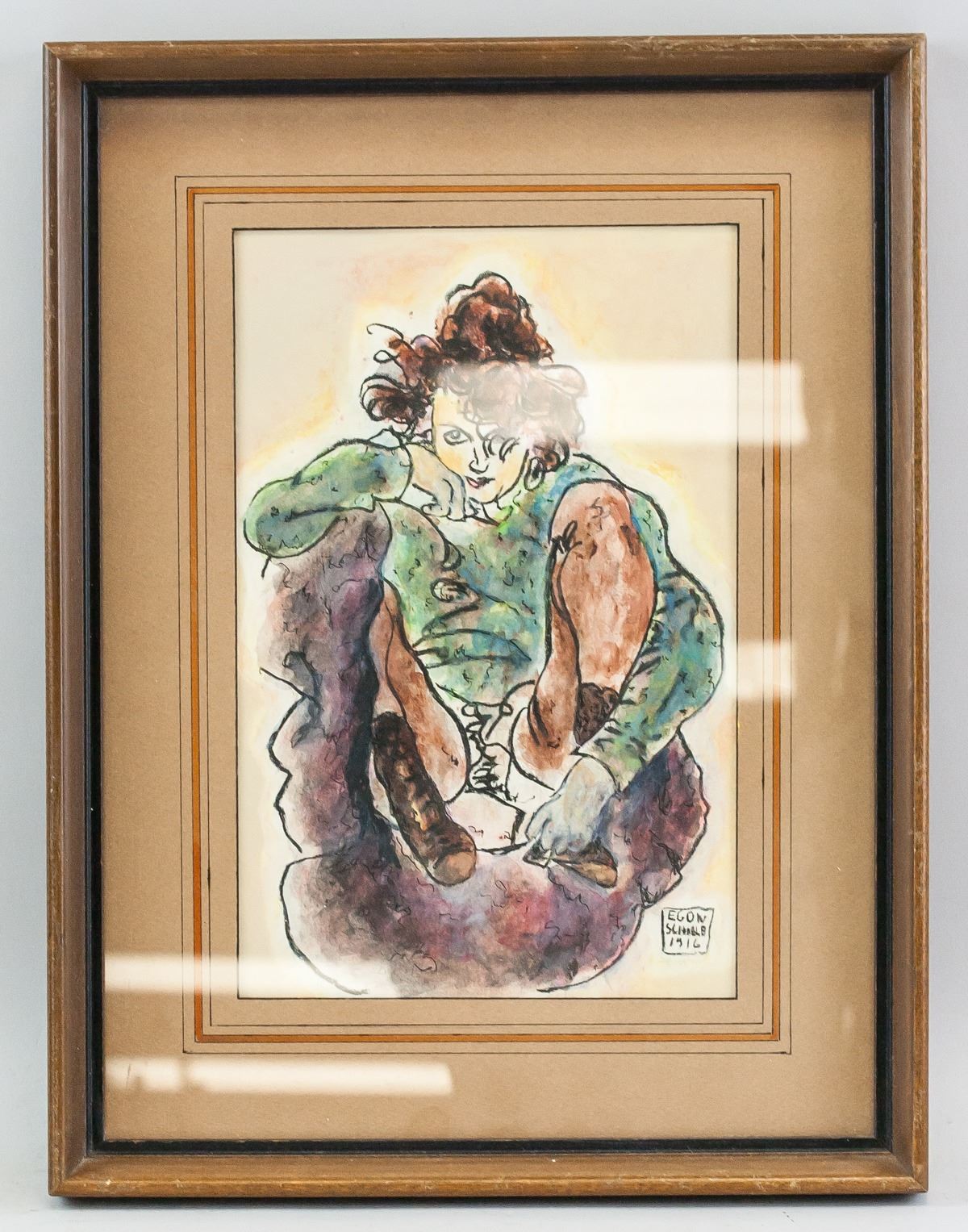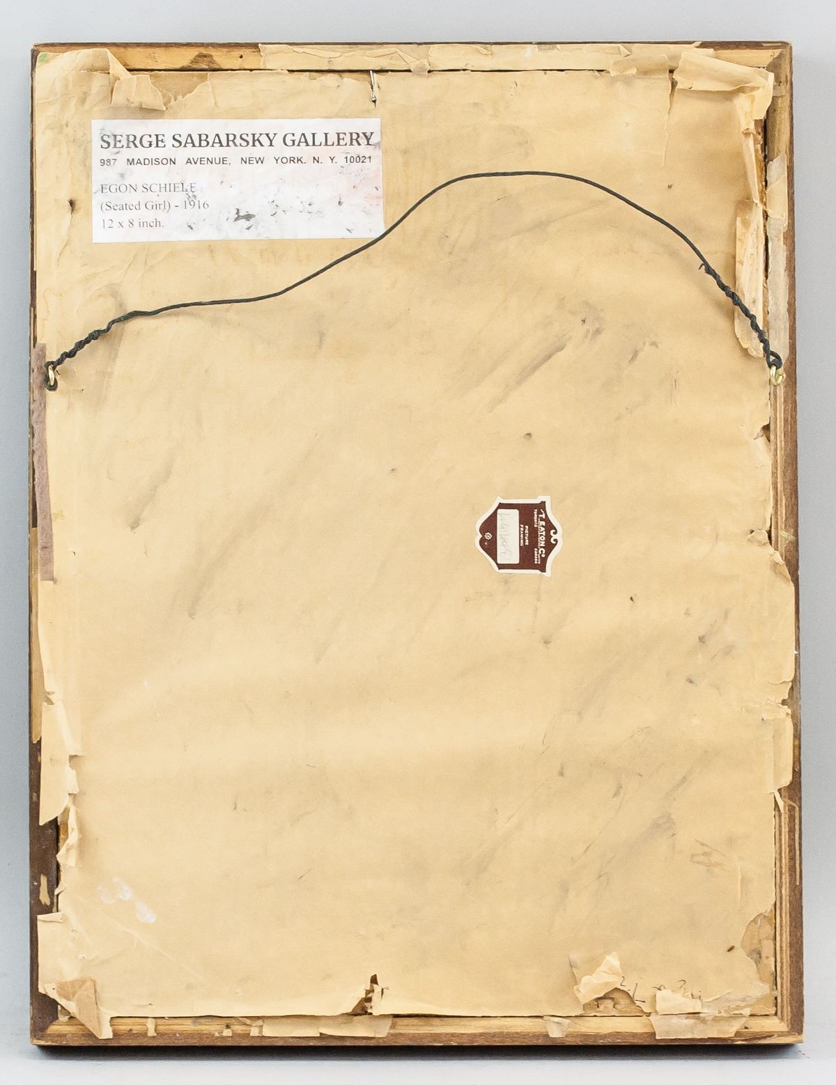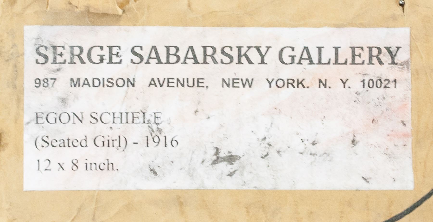 Mixed media on paper, framed. Featuring a portrait of a woman. Signed EGON SCHIELE and inscribed 1916 underneath on the lower right corner. Gallery label affixed to verso isncribed SERGE SABARSKY GALLERY / 987 MADISON AVENUE, NEW YORK. N. Y. 10021 / EGON SCHIELE / (Seated Girl) - 1916 / 12 x 8 inch. Another label inscribed The T. EATON Co / HOUSEFURNISHINGS UNITED / TORONTO / CANADA / PICTURE FRAMING with inscription in pencil 4914981. Attributed to Egon Schiele (1890-1918, Austrian). 29 x 18 cm (11.5 x 7.5 in), Frame: 43 x 33 cm (17 x 13 in). PROVENANCE: This lot carries limited provenance from a Southern Ontario private collection