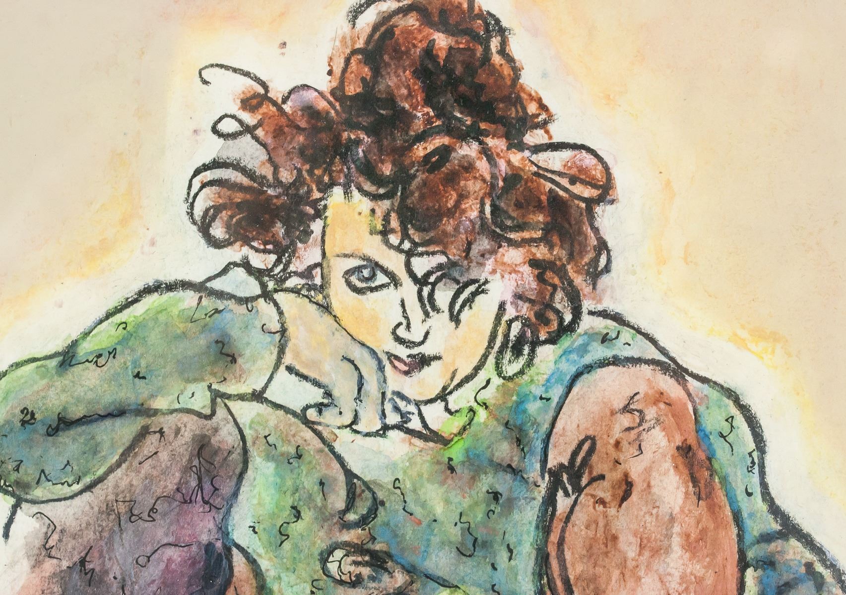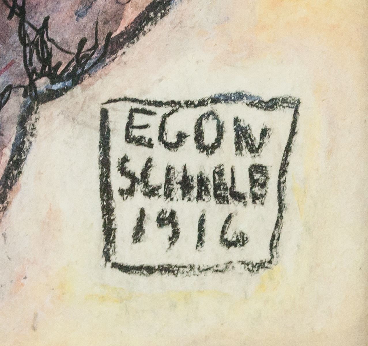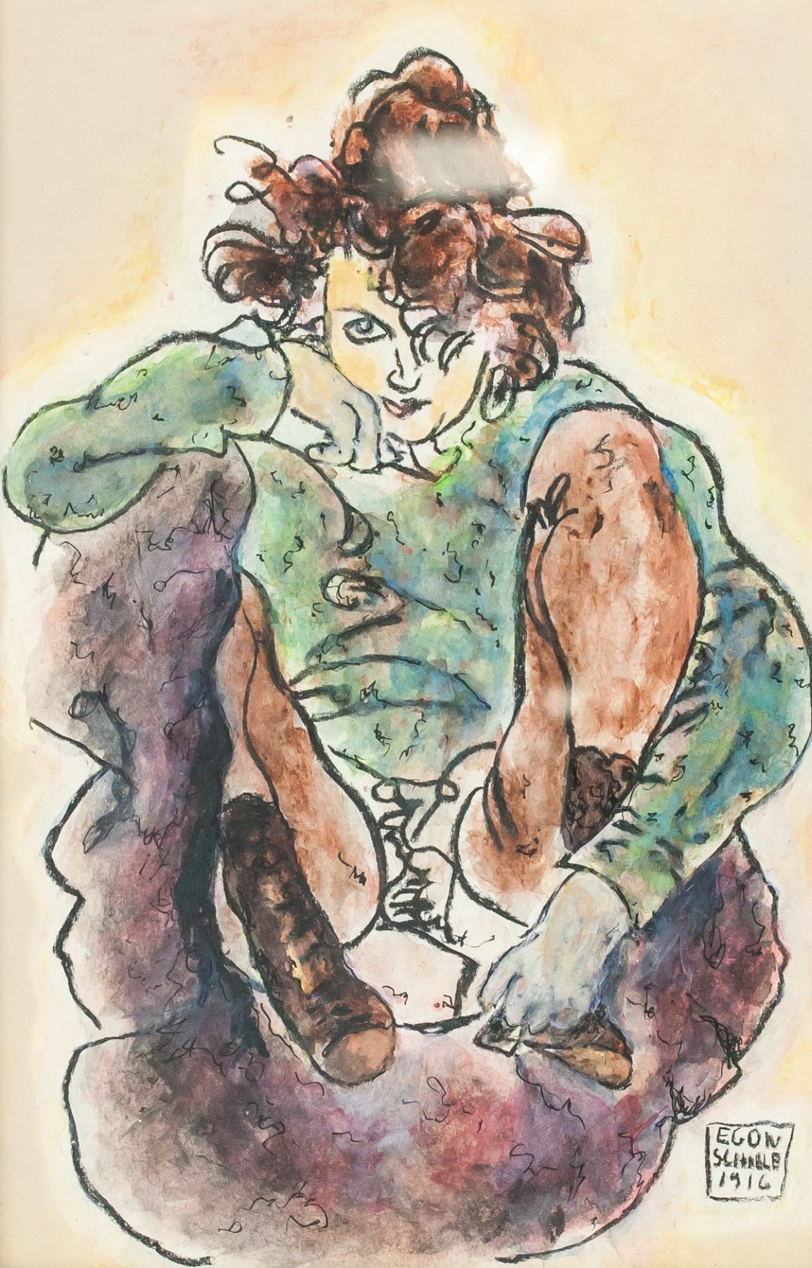 Mixed media on paper, framed. Featuring a portrait of a woman. Signed EGON SCHIELE and inscribed 1916 underneath on the lower right corner. Gallery label affixed to verso isncribed SERGE SABARSKY GALLERY / 987 MADISON AVENUE, NEW YORK. N. Y. 10021 / EGON SCHIELE / (Seated Girl) - 1916 / 12 x 8 inch. Another label inscribed The T. EATON Co / HOUSEFURNISHINGS UNITED / TORONTO / CANADA / PICTURE FRAMING with inscription in pencil 4914981. Attributed to Egon Schiele (1890-1918, Austrian). 29 x 18 cm (11.5 x 7.5 in), Frame: 43 x 33 cm (17 x 13 in). PROVENANCE: This lot carries limited provenance from a Southern Ontario private collection