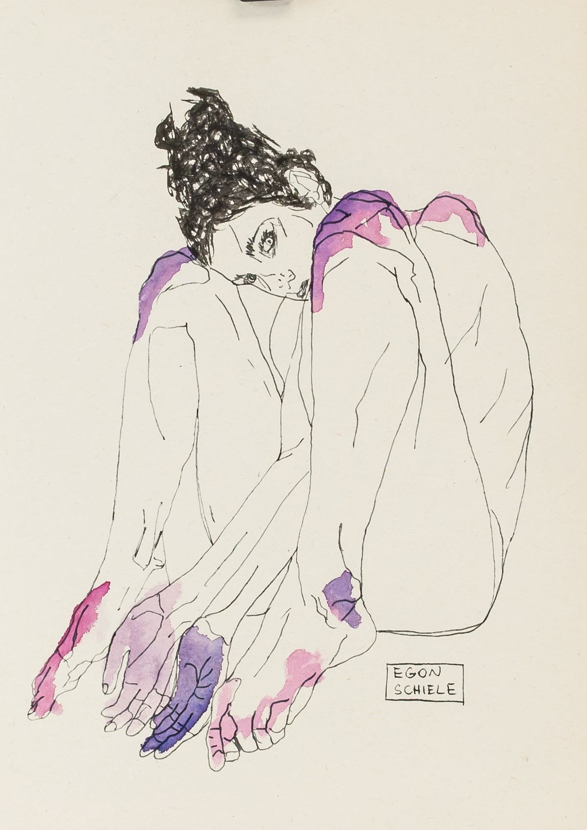 Ink and watercolor on paper. Featuring sketch of a nude female figure. Signed "EGON SCHIELE" near the bottom right corner. Attributed to Egon Schiele (1890-1918, Austrian). 29 x 20 cm (11.5 x 8 inches). Provenance: This lot carries limited provenance from a Southern Ontario estate.