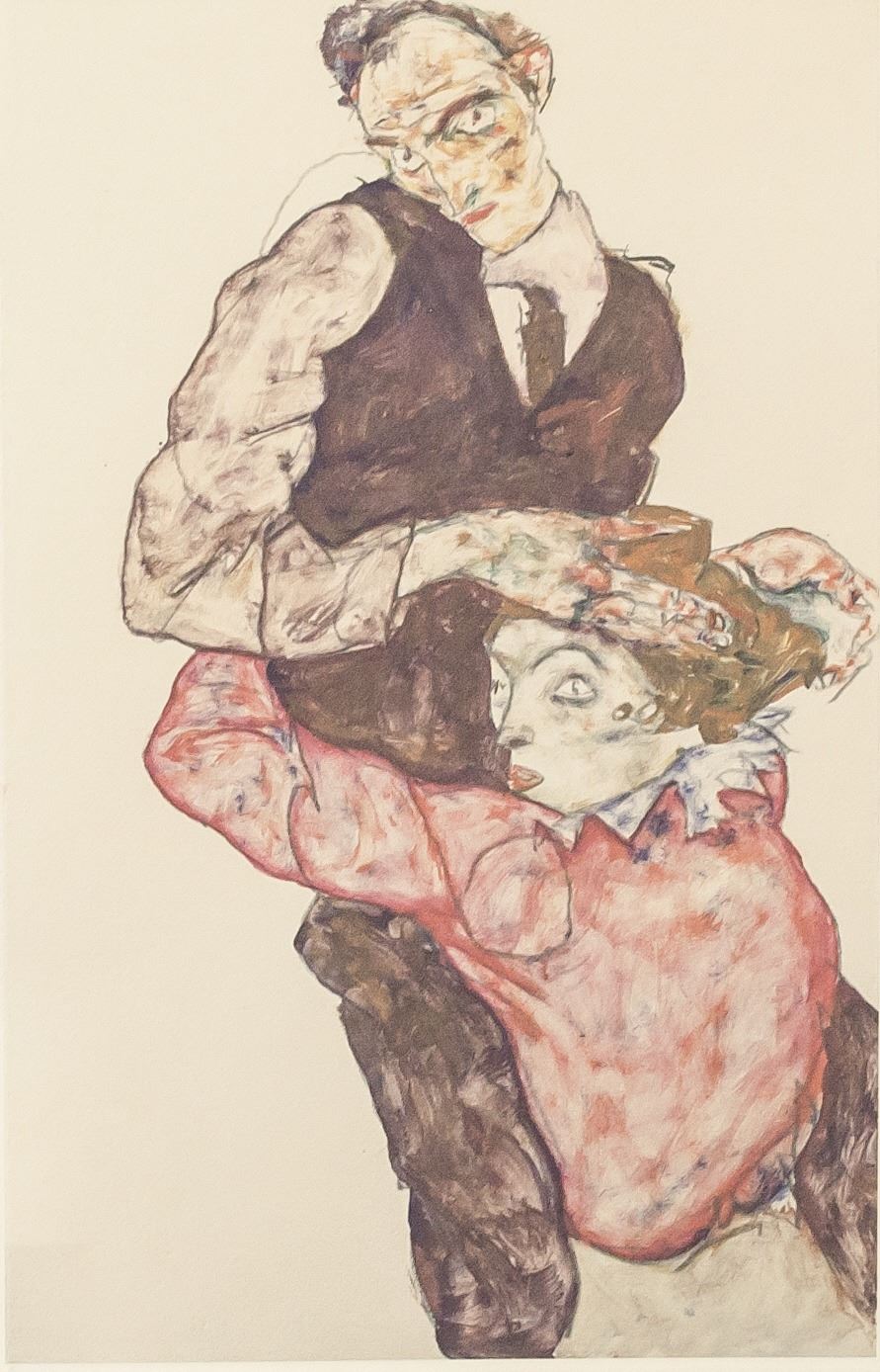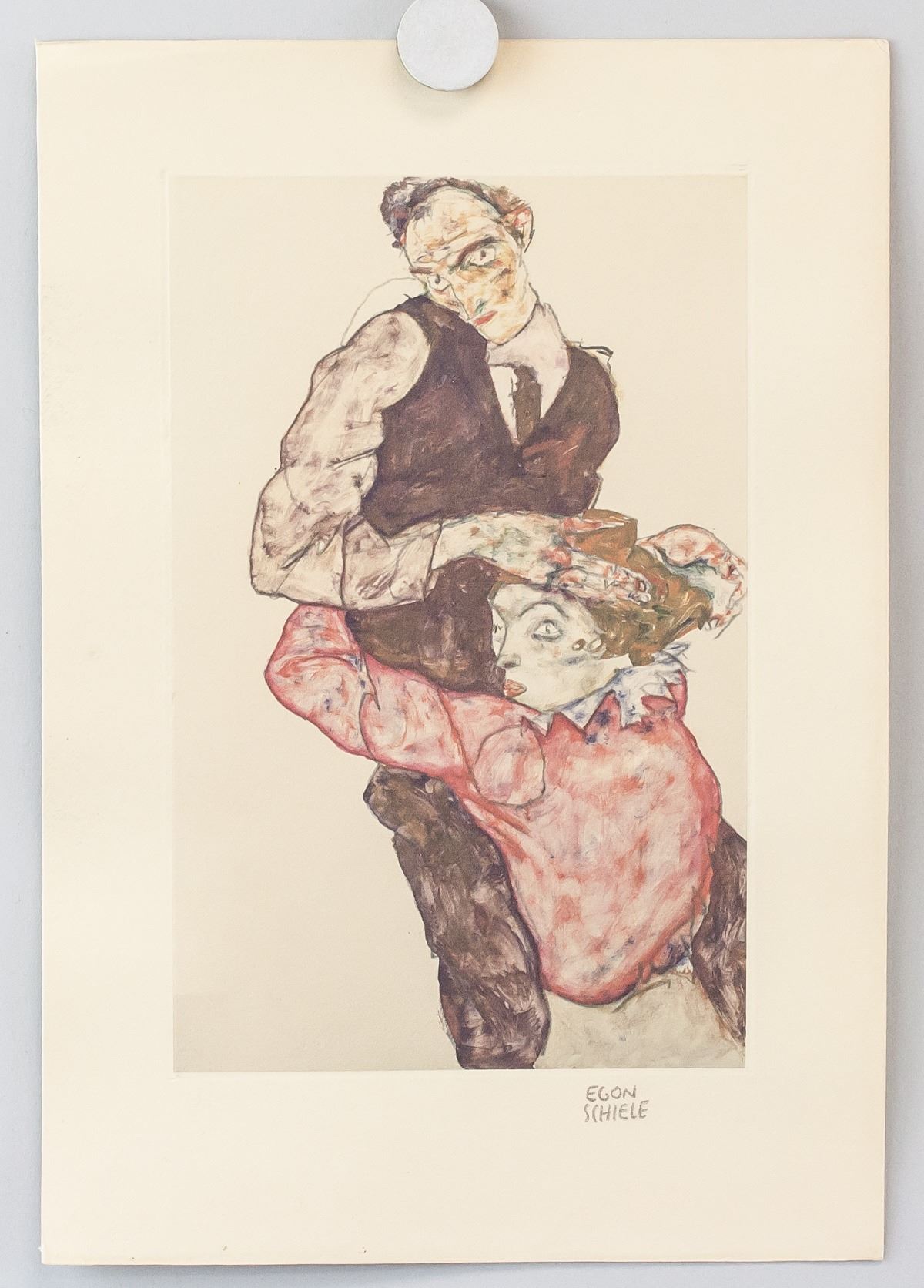 Linocut on paper. Featuring a portrait of a couple. Signed EGON SCHIELE on the lower right corner in pencil. Attributed to Egon Schiele (1890-1918, Austrian). Plate size: 22 x 14 cm (8.75 x 5.5 inches). Paper size: 30 x 21 cm (12 x 8.25 inches). Provenance: This lot carries limited provenance from a Southern Ontario estate