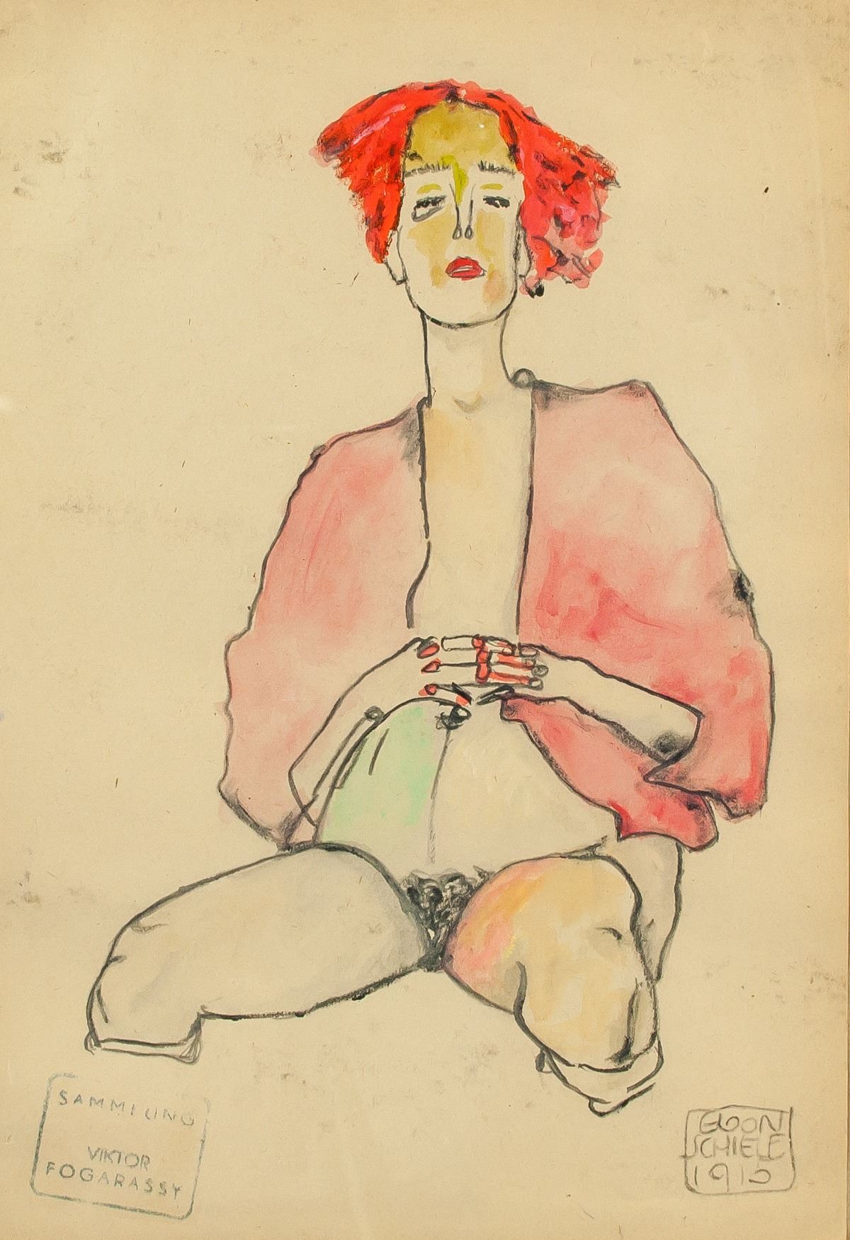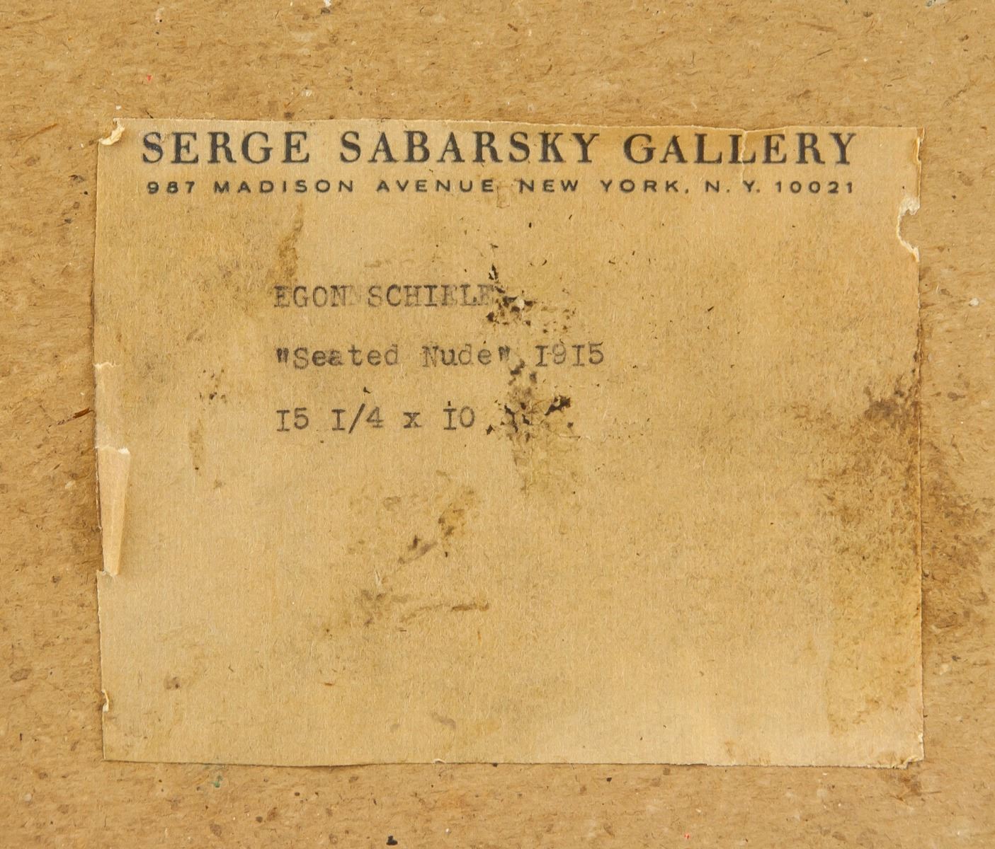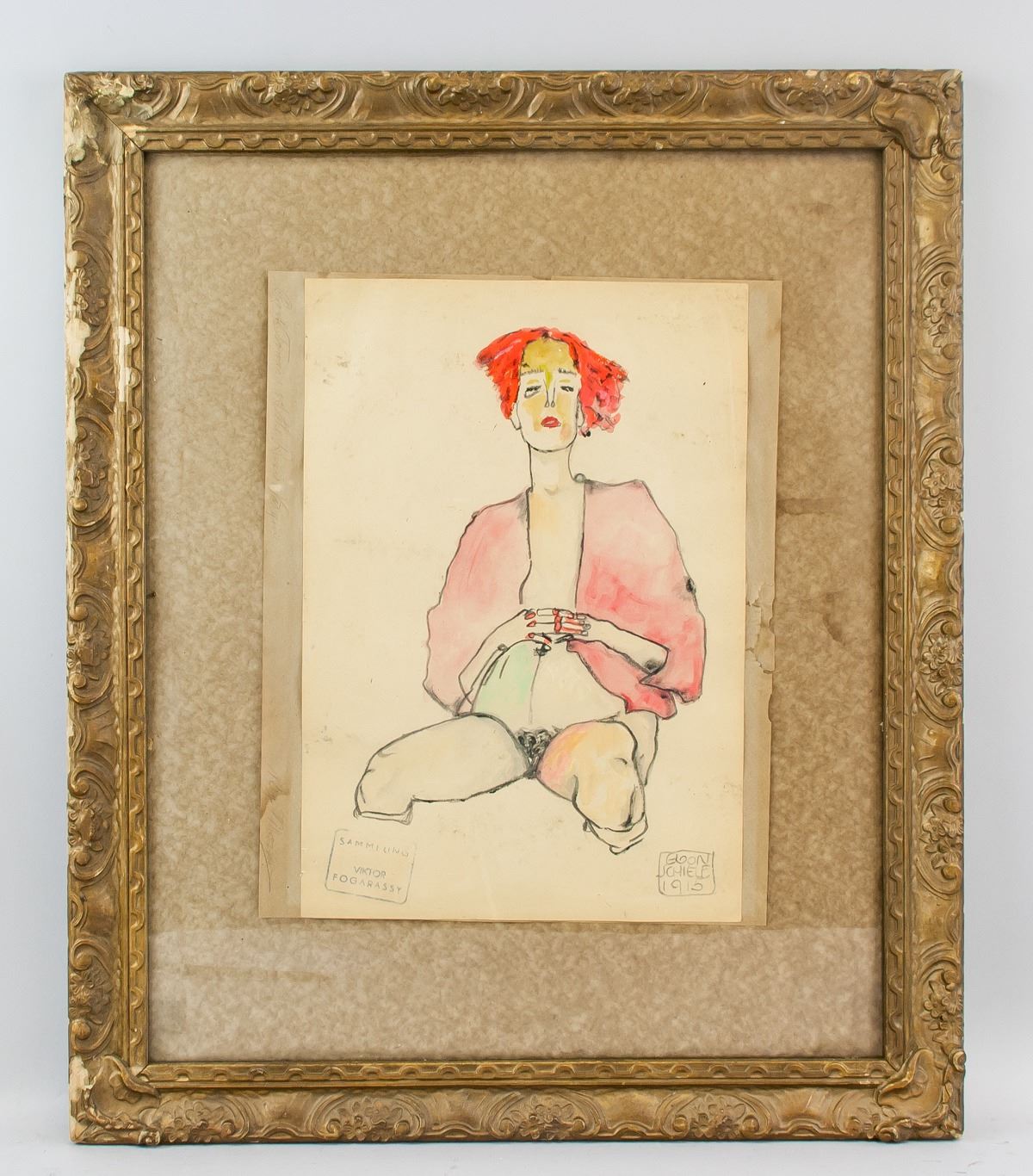 Watercolor on paper, framed. Featuring a portrait, nude. Stamped SAMMIUNO / VIKTOR / FOGARASSY on the lower left corner. Signed Egon Schiele (1890-1918, Austrian) and inscribed 1915 on the lower right corner. Signed along left edge with signature in pencil. On verso, label inscribed SERGE SABARSKY GALLERY (987 Madison Avenue New York, N. Y. 10021 and underneath inscribed EGON SCHIELE / "Seated Nude 1915 / 15 1/4 x x10.? ARCHIV / NEUE / GALERIE / NR. 324 stamped on verso. Another label inscribed Tho S. Agnew & Sons (Manchester, Liverpool: 15 Exchange Street). Exchange Art Gallery Dale Street. London Old Bond St. Galleries Piccadilly. 38.5 x 30 cm (15.2 x 11.8 inches). Frame size: 64.5 x 54 cm (25.4 x 21.3 inches). PROVENANCE: Private American collection (New York, United States)