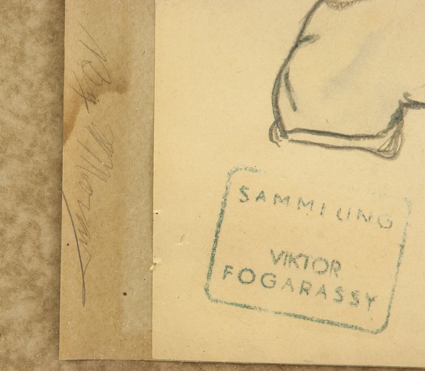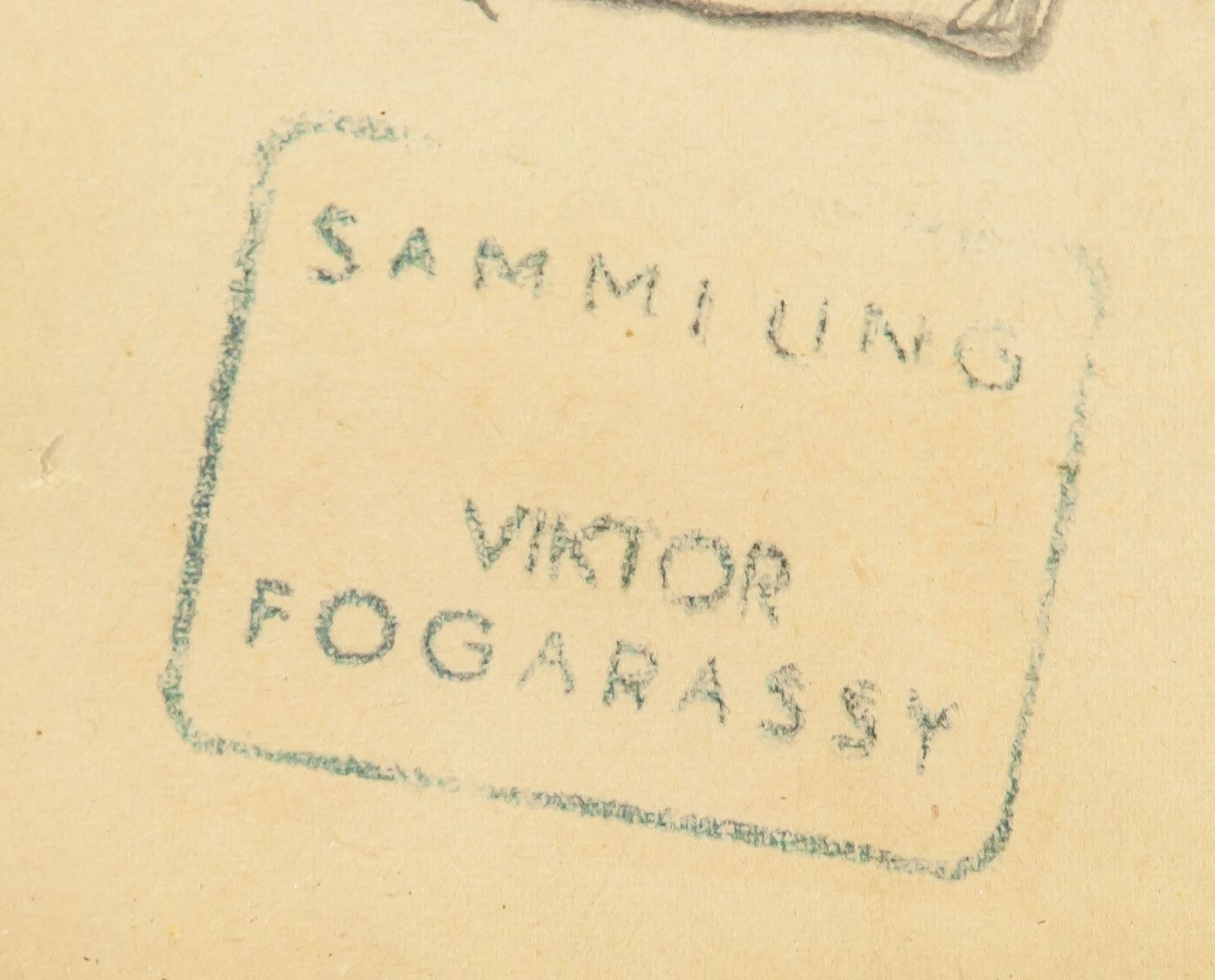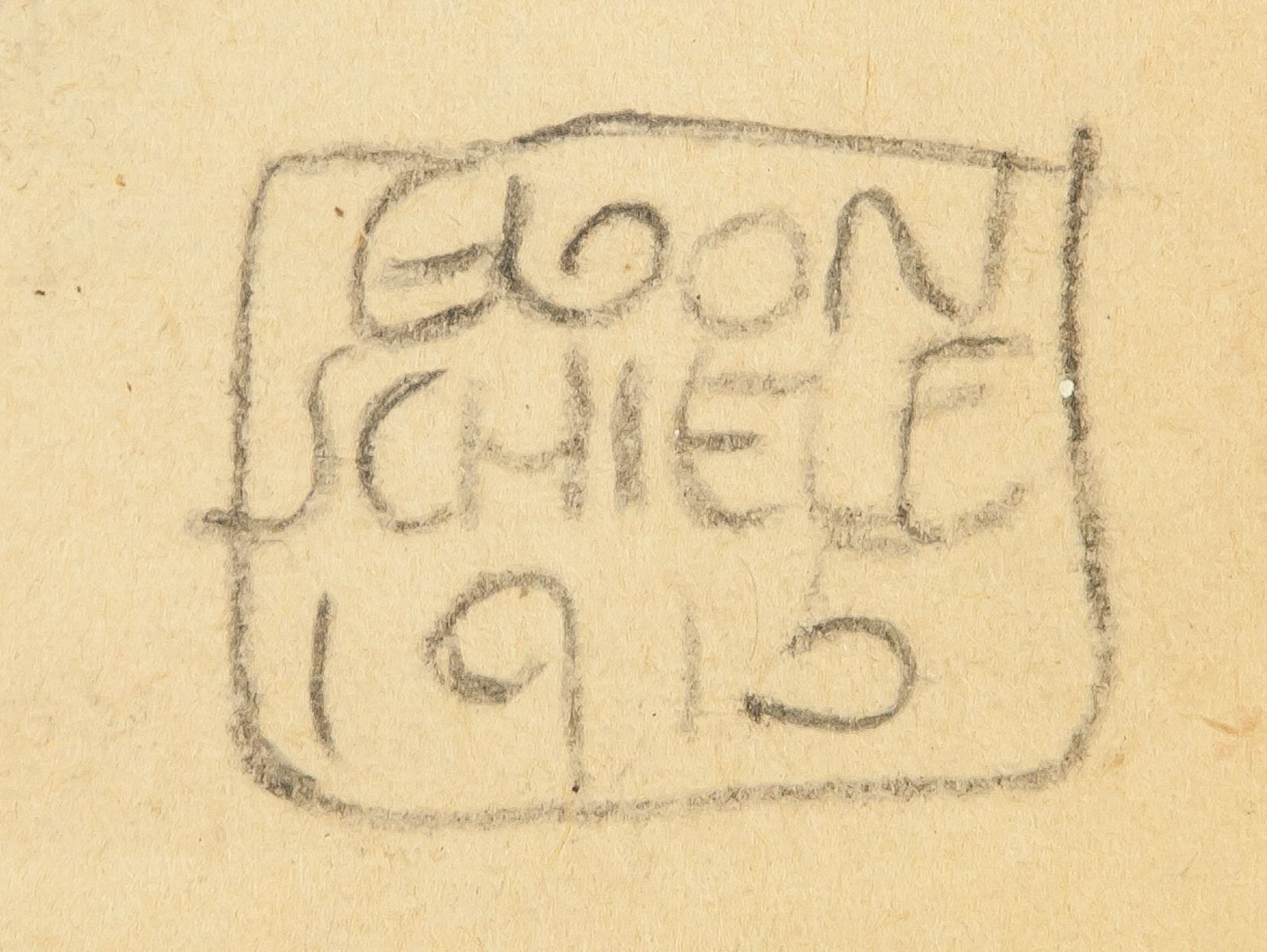 Watercolor on paper, framed. Featuring a portrait, nude. Stamped SAMMIUNO / VIKTOR / FOGARASSY on the lower left corner. Signed Egon Schiele (1890-1918, Austrian) and inscribed 1915 on the lower right corner. Signed along left edge with signature in pencil. On verso, label inscribed SERGE SABARSKY GALLERY (987 Madison Avenue New York, N. Y. 10021 and underneath inscribed EGON SCHIELE / "Seated Nude 1915 / 15 1/4 x x10.? ARCHIV / NEUE / GALERIE / NR. 324 stamped on verso. Another label inscribed Tho S. Agnew & Sons (Manchester, Liverpool: 15 Exchange Street). Exchange Art Gallery Dale Street. London Old Bond St. Galleries Piccadilly. 38.5 x 30 cm (15.2 x 11.8 inches). Frame size: 64.5 x 54 cm (25.4 x 21.3 inches). PROVENANCE: Private American collection (New York, United States)