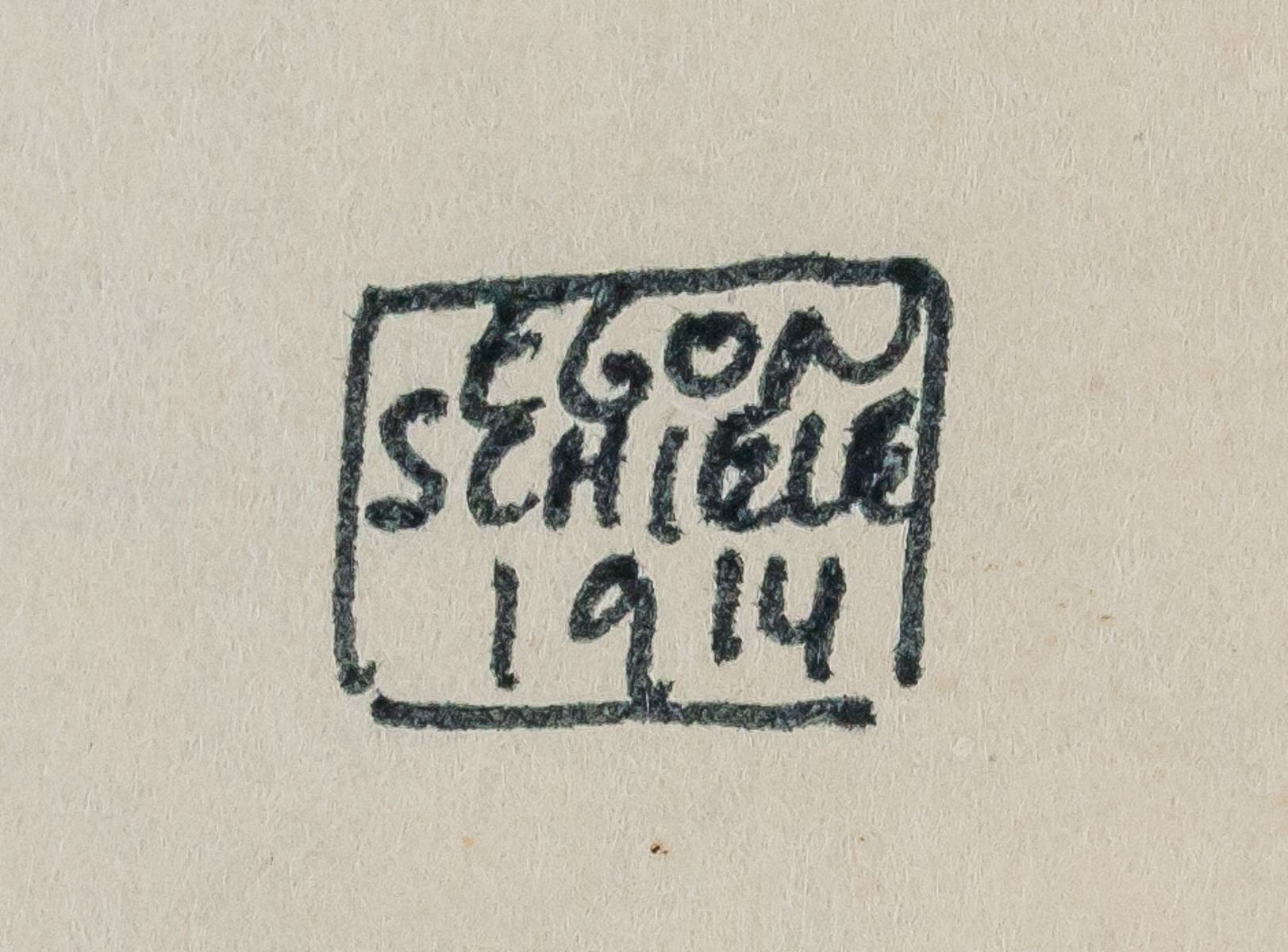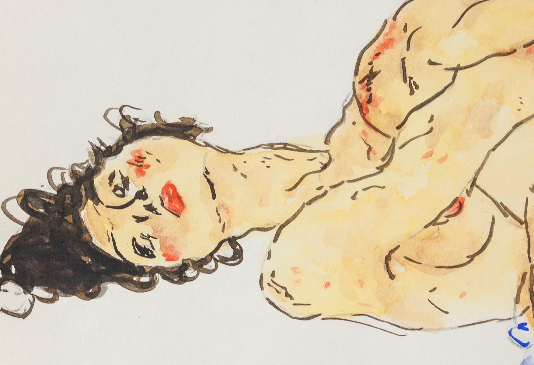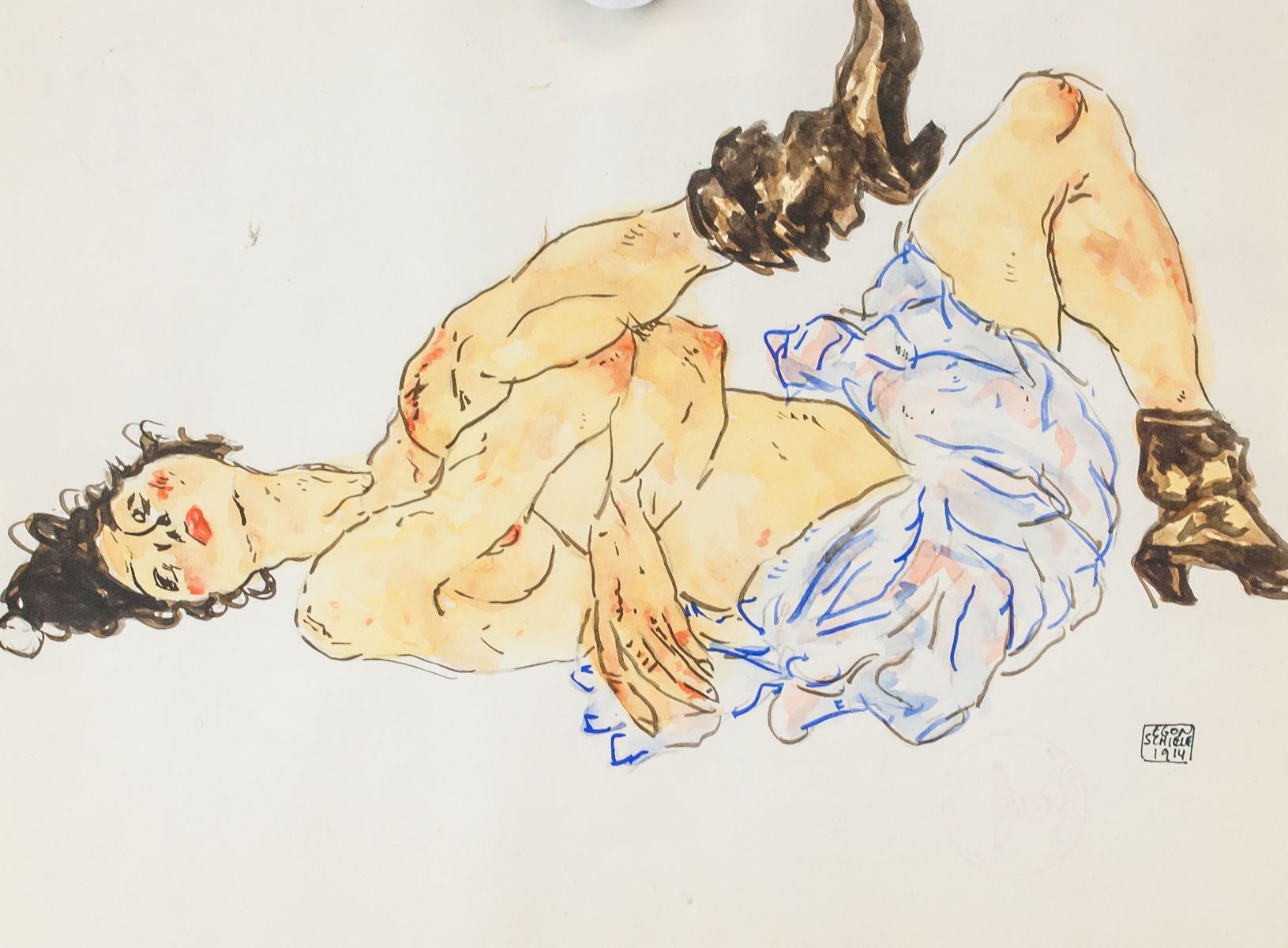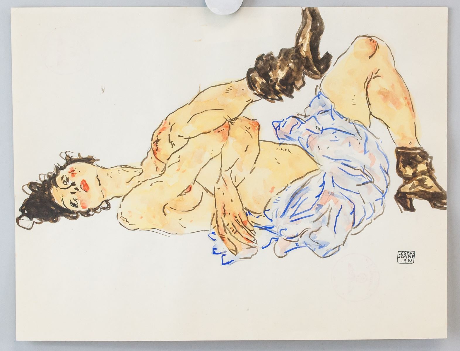 Watercolor on paper. Featuring a woman lying on her back with one leg pulled up the her chest and her arms hooked under the need. The figure is nude except for a white cloth and shoes. Signed "EGON SCHIELE 1914" to the bottom right. Two illegible stamps bearing the Nazi emblem on verso. Attributed to Egon Schiele (1890-1918, Austrian). 21.5 x 28 cm (8.5 x 11 in)