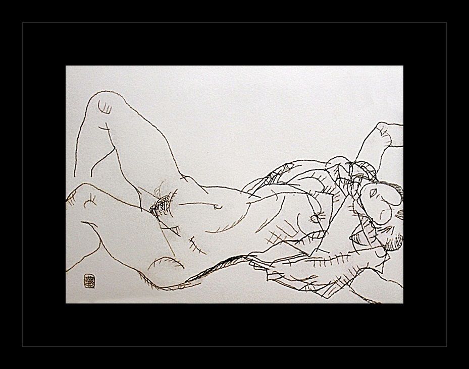 Erotic sketch lithograph by Egon Schiele. Comes gallery framed black on black.