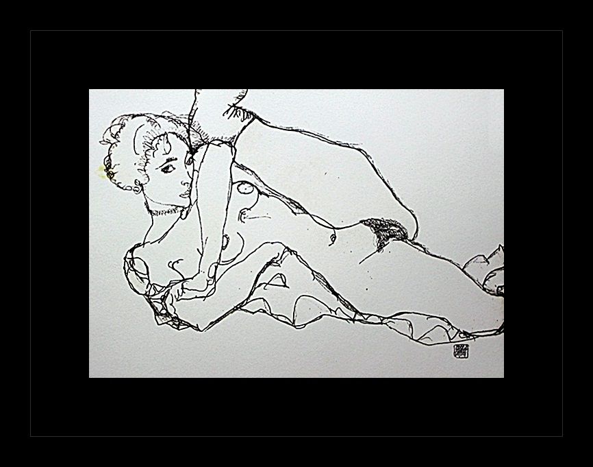 Erotic sketch lithograph by Egon Schiele. Comes gallery framed black on black.