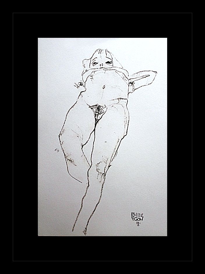 Erotic sketch lithograph by Egon Schiele. Comes gallery framed black on black.
