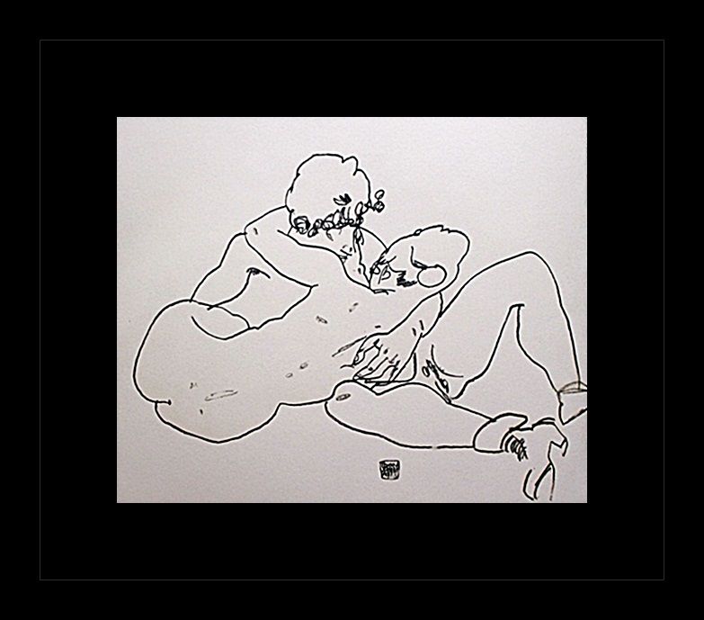 Erotic sketch lithograph by Egon Schiele. Comes gallery framed black on black.