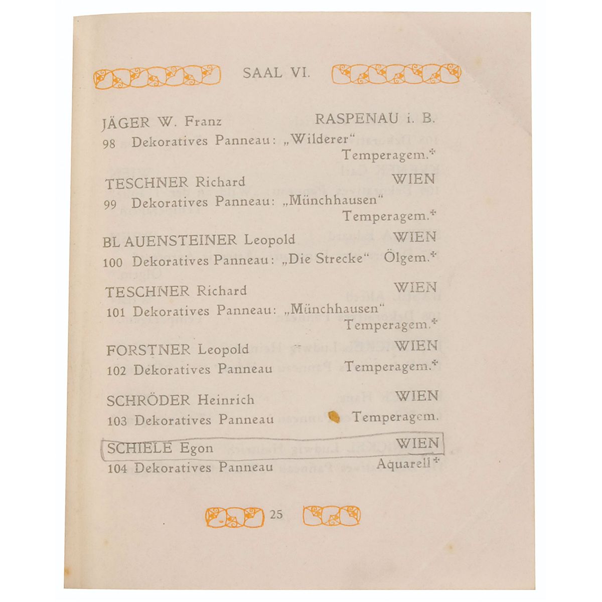 Influential, forward-looking Austrian artist (1890–1918) who takes a place among the leading figures of the Expressionist movement of the early 20th century. Schiele was among the millions of Europeans who succumbed to the Spanish flu during the epidemic of 1918. Signed book: I. Internationale Jagd Ausstellung, Vienna 1910, Kunst, Pavillon. Vienna: J. Weiner, 1910. Softcover, 5.5 x 6, 67 pages. Boldly signed in black ink on the title page by Schiele. Autographic condition: fine, with a few surface impressions to title page. Book condition: VG-/None. Schiele participated in this exhibition, showing his watercolor ‘Dekoratives Panneau’ in room six.