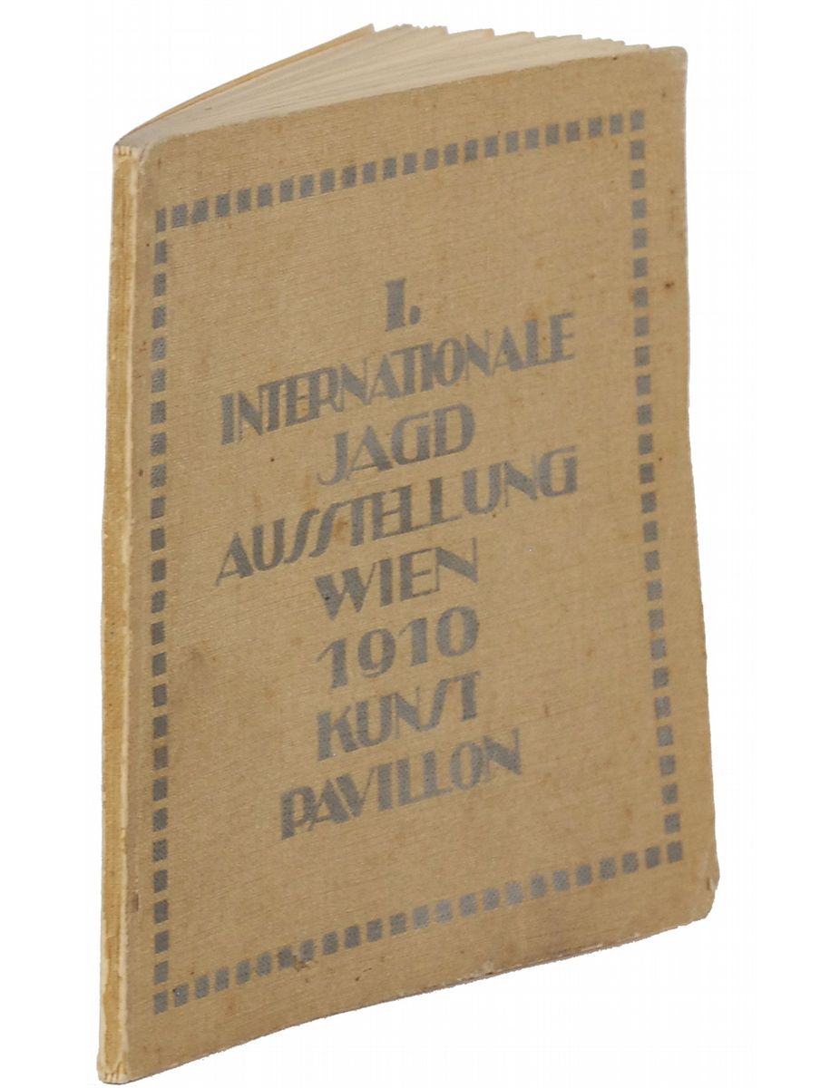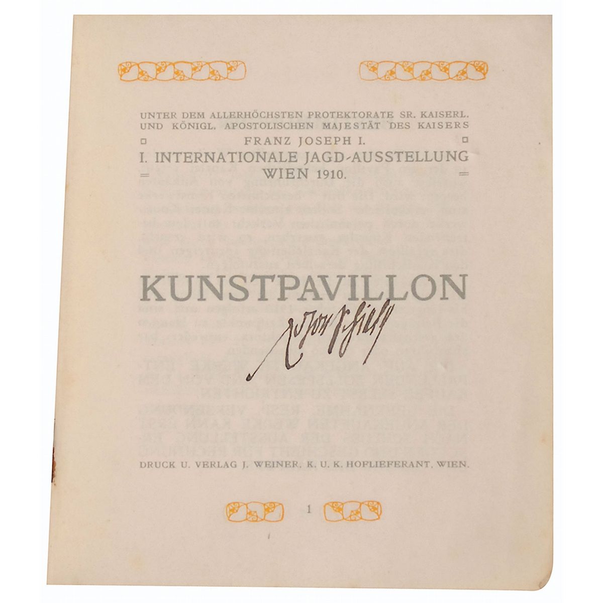 Influential, forward-looking Austrian artist (1890–1918) who takes a place among the leading figures of the Expressionist movement of the early 20th century. Schiele was among the millions of Europeans who succumbed to the Spanish flu during the epidemic of 1918. Signed book: I. Internationale Jagd Ausstellung, Vienna 1910, Kunst, Pavillon. Vienna: J. Weiner, 1910. Softcover, 5.5 x 6, 67 pages. Boldly signed in black ink on the title page by Schiele. Autographic condition: fine, with a few surface impressions to title page. Book condition: VG-/None. Schiele participated in this exhibition, showing his watercolor ‘Dekoratives Panneau’ in room six.