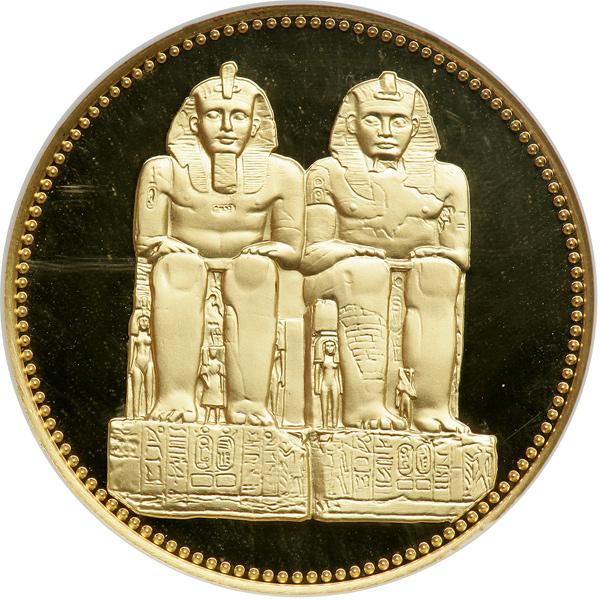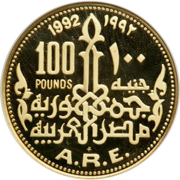 Egypt. 100 Pounds, 1992. Fr-165; KM-730. Weight 0.4962 ounce. The Golden Guardians. Reverse: Two statues of Ramses II. NGC graded Proof 69 Ultra Cameo.