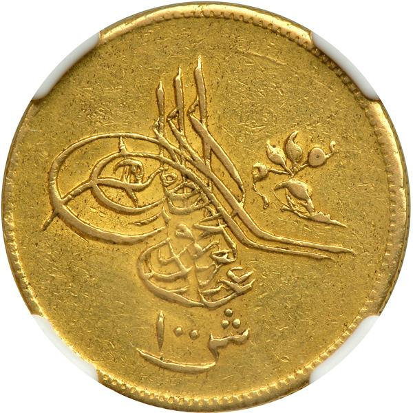 Egypt. 100 Qirsh, AH1277 (Year 10). Fr-11; KM-263. Weight 0.2404 ounce. Abdul Aziz, 1861-1876. Flower at right of toughra. NGC graded AU-50.
