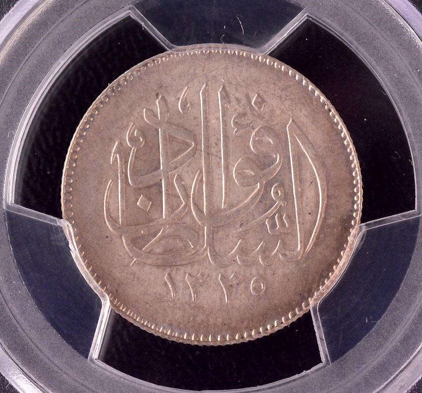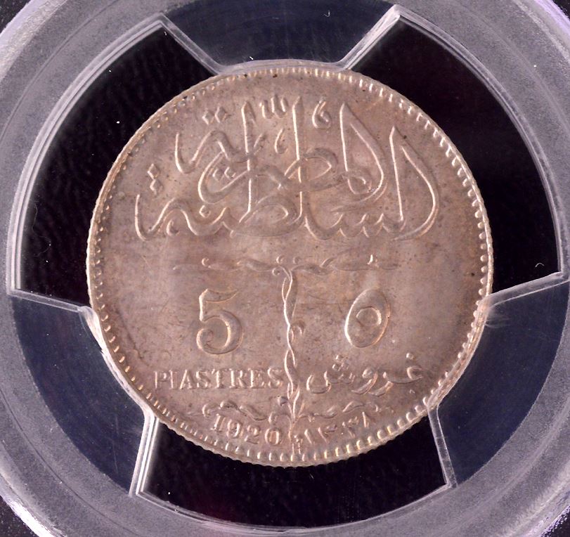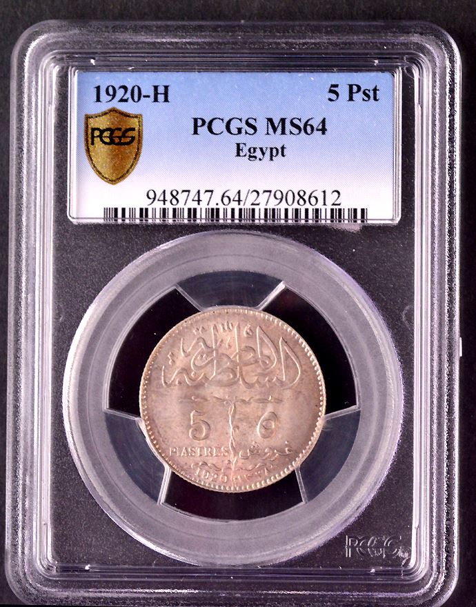 Egypt, 5 Piastres, Silver, AH1338, 1920-H, KM#326, graded by PCGS Mintstate-64. Another lovely choice to Gem example, with a hint of colour.