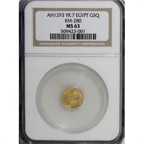 <B>Abdul Hamid II gold 5 Piastres 1293AH Year 7,</B></I> KM280, MS63 NGC, a choice example with very sharp details, typically slightly concave (as struck.) One of the last coins struck at the old Cairo Mint before the coinage reform instituted in year 10.<BR><BR><b>Shipping:</b> Coins & Currency (<a target="_blank" href="http://www.heritageauctions.com/common/shipping.php">view shipping information</a>)