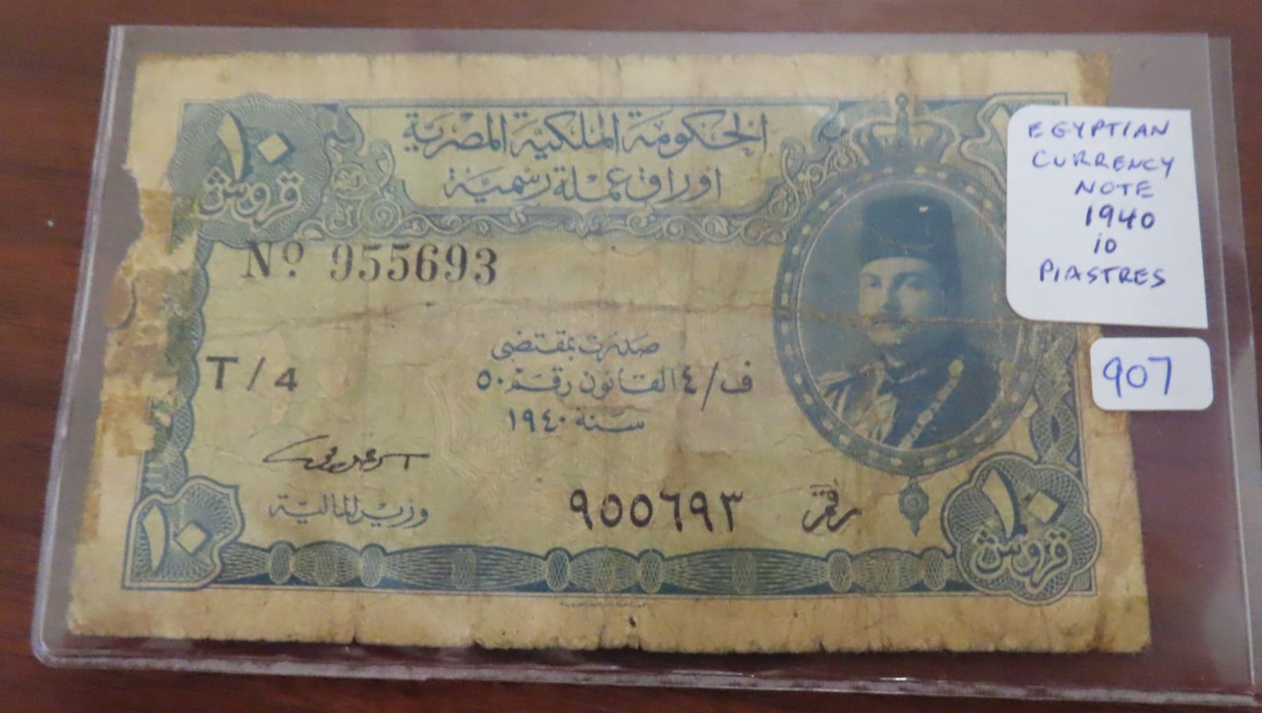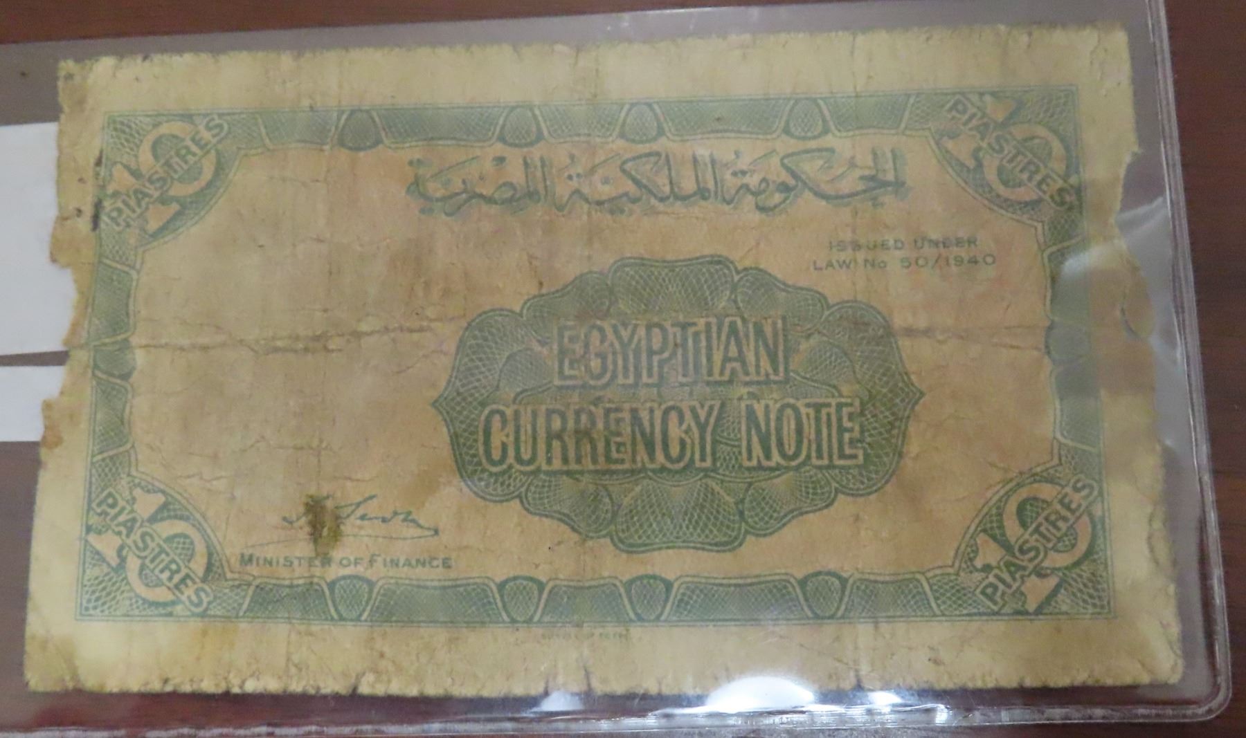 Egypt. Egyptian Currency Note. L-1940 but dated 1945. 10 Piastres. King Farouk. Issued during the last year of World War II. Good.