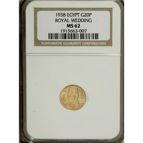 <B>Farouk gold 20 Piastres 1938, </B></I>KM370, MS62 NGC.<BR><BR><b>Shipping:</b> Coins & Currency (<a target="_blank" href="http://www.heritageauctions.com/common/shipping.php">view shipping information</a>)