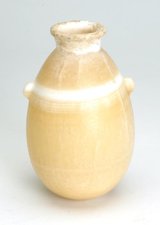 Egyptian Alabastron in alabaster. 26th Dynasty. Twin lug handles below natural white band. Choice condition. Height 4¼".