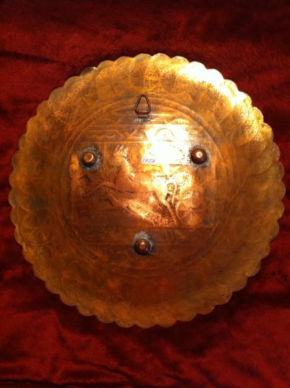 This is a copper platter with scalloped edges which has been hand made and nickel etched depicting an Egyptian archer riding in his chariot taking aim with his bow and arrow . The plate measures 12" in diameter. The platter has been altered in the back to be able to hang.