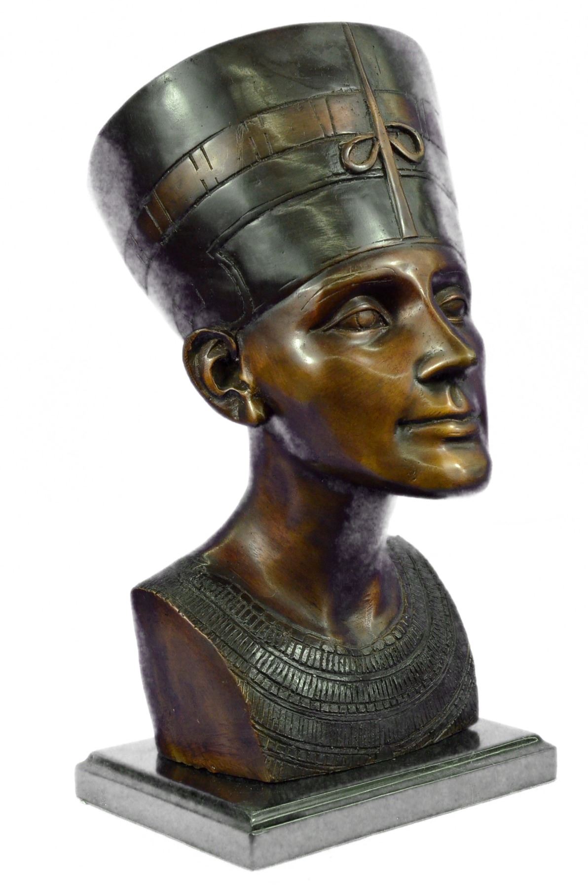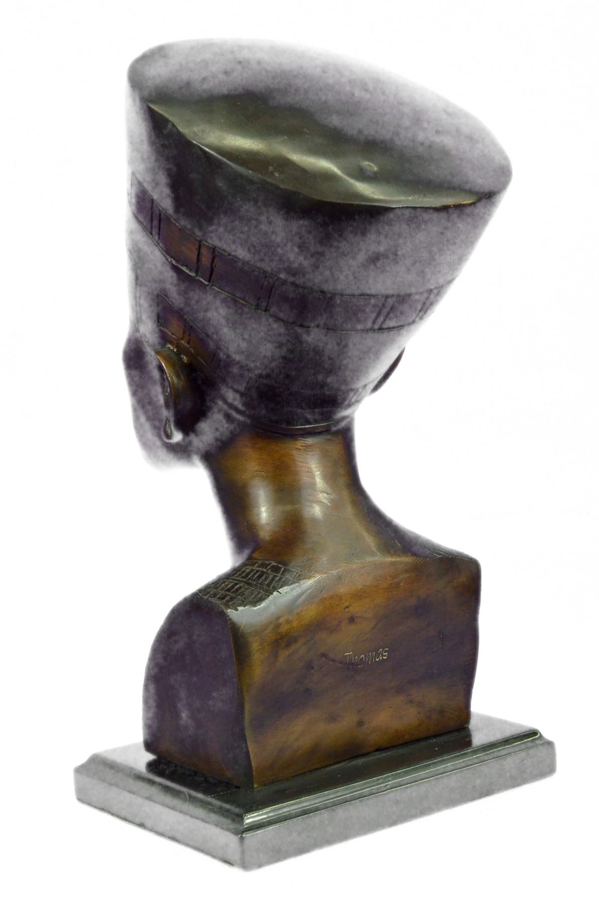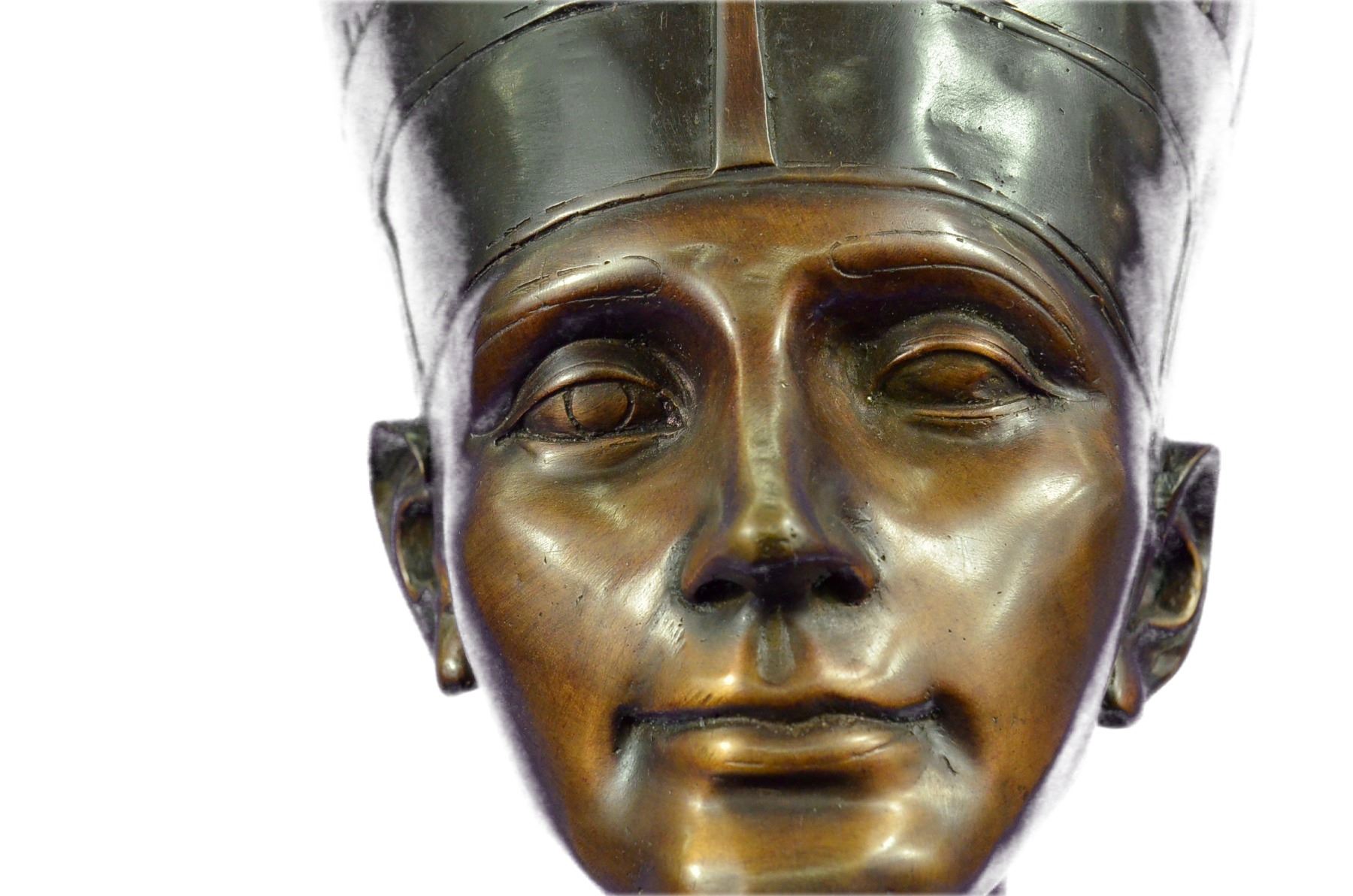 This is a beautiful statue of Nefertiti. Her name roughly translates to the beautiful one is to come. Famed throughout the ancient world and within our present world for her outstanding beauty, Nefertiti remains one of the most well known queens of Egypt. Her head is adorned with a high head dress, with precision it is painted in blue, green, red and gold patina. Her chin is pronounced, her nose is straight and narrow, her eyes majestic and powerful and her cheek bones high. The detailing in this and her ears are truly remarkable. Around her neck is a wide collar necklace which in her day would be beaded with an elongated gold bead named after her called Nefer and jade beads. On this sculpture this is portrayed by even more colors in patina. Her skin glows golden and this replica of the famous statue is one you are sure to admire year after year. This is bronze and has a brown colored patina and made using the lost wax method. Bronze dimensions with marble base: Height 16 X Width 10 inches. Weight: 18 lbs.Please Note: This is a reproduction bronze sculpture from the original molded and signed. This featured bronze sculpture is a recast after the original, and has been done recently. This 100% bronze sculpture is an abstract piece certain to be a conversation piece.Please Note: This is a reproduction bronze sculpture from the original molded and signed. This featured bronze sculpture is a recast after the original, and has been done recently. This 100% bronze sculpture is an abstract piece certain to be a conversation piece.