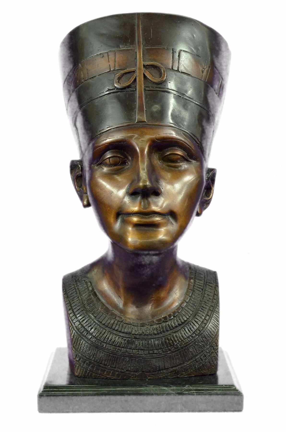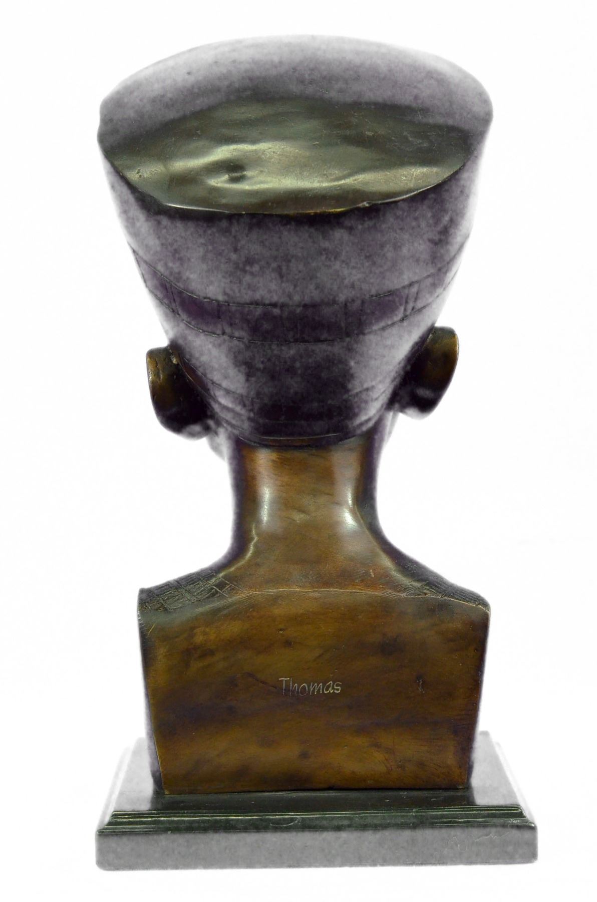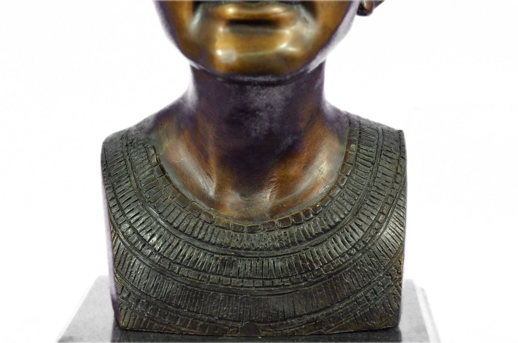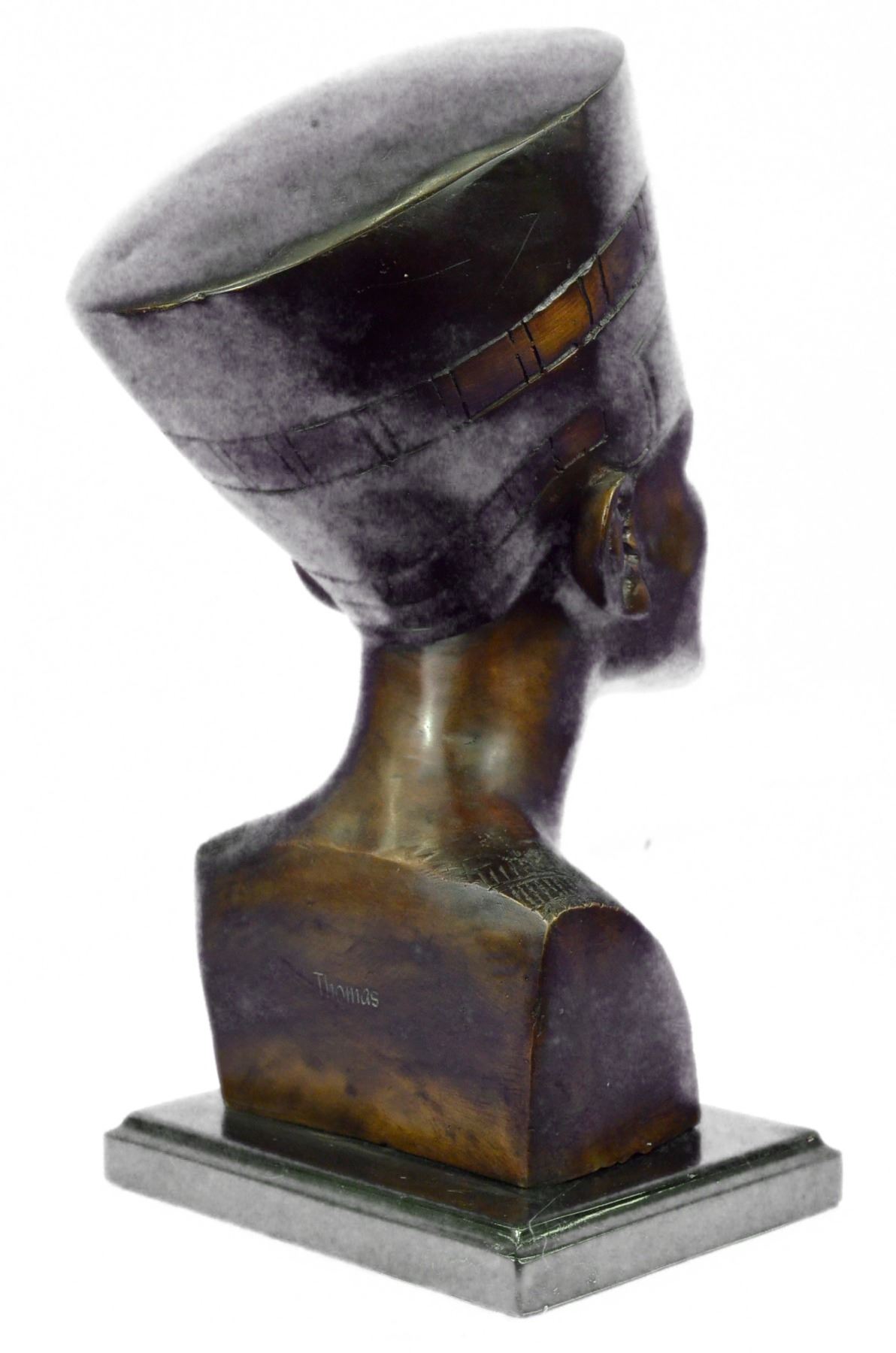 This is a beautiful statue of Nefertiti. Her name roughly translates to the beautiful one is to come. Famed throughout the ancient world and within our present world for her outstanding beauty, Nefertiti remains one of the most well known queens of Egypt. Her head is adorned with a high head dress, with precision it is painted in blue, green, red and gold patina. Her chin is pronounced, her nose is straight and narrow, her eyes majestic and powerful and her cheek bones high. The detailing in this and her ears are truly remarkable. Around her neck is a wide collar necklace which in her day would be beaded with an elongated gold bead named after her called Nefer and jade beads. On this sculpture this is portrayed by even more colors in patina. Her skin glows golden and this replica of the famous statue is one you are sure to admire year after year. This is bronze and has a brown colored patina and made using the lost wax method. Bronze dimensions with marble base: Height 16 X Width 10 inches. Weight: 18 lbs.Please Note: This is a reproduction bronze sculpture from the original molded and signed. This featured bronze sculpture is a recast after the original, and has been done recently. This 100% bronze sculpture is an abstract piece certain to be a conversation piece.Please Note: This is a reproduction bronze sculpture from the original molded and signed. This featured bronze sculpture is a recast after the original, and has been done recently. This 100% bronze sculpture is an abstract piece certain to be a conversation piece.