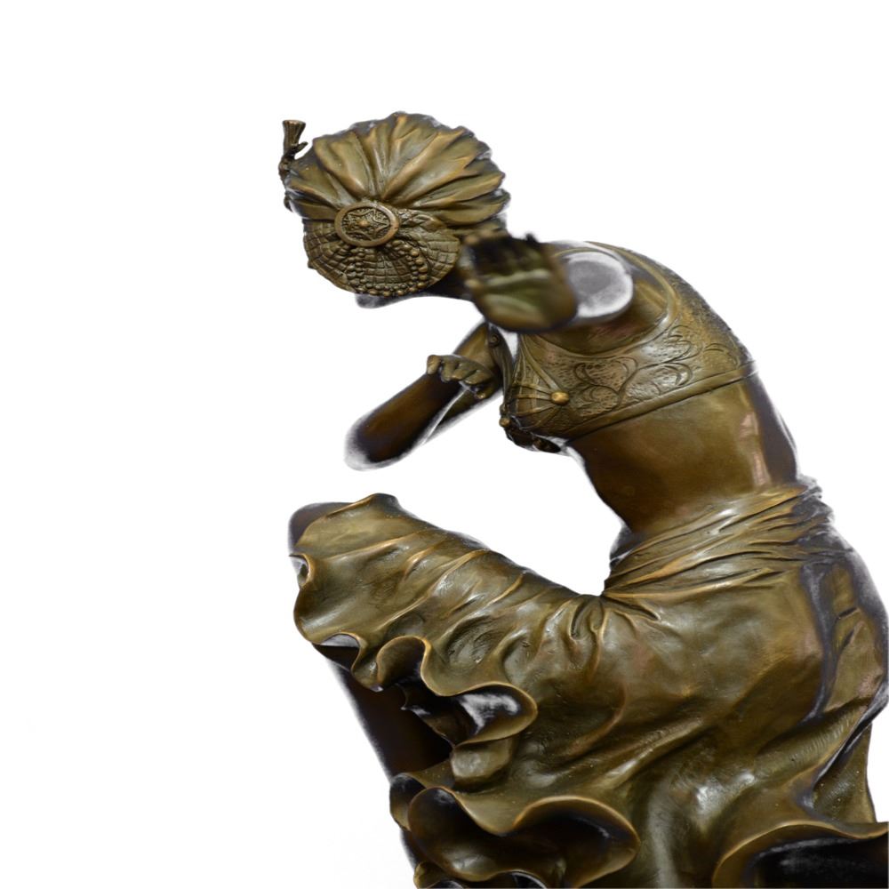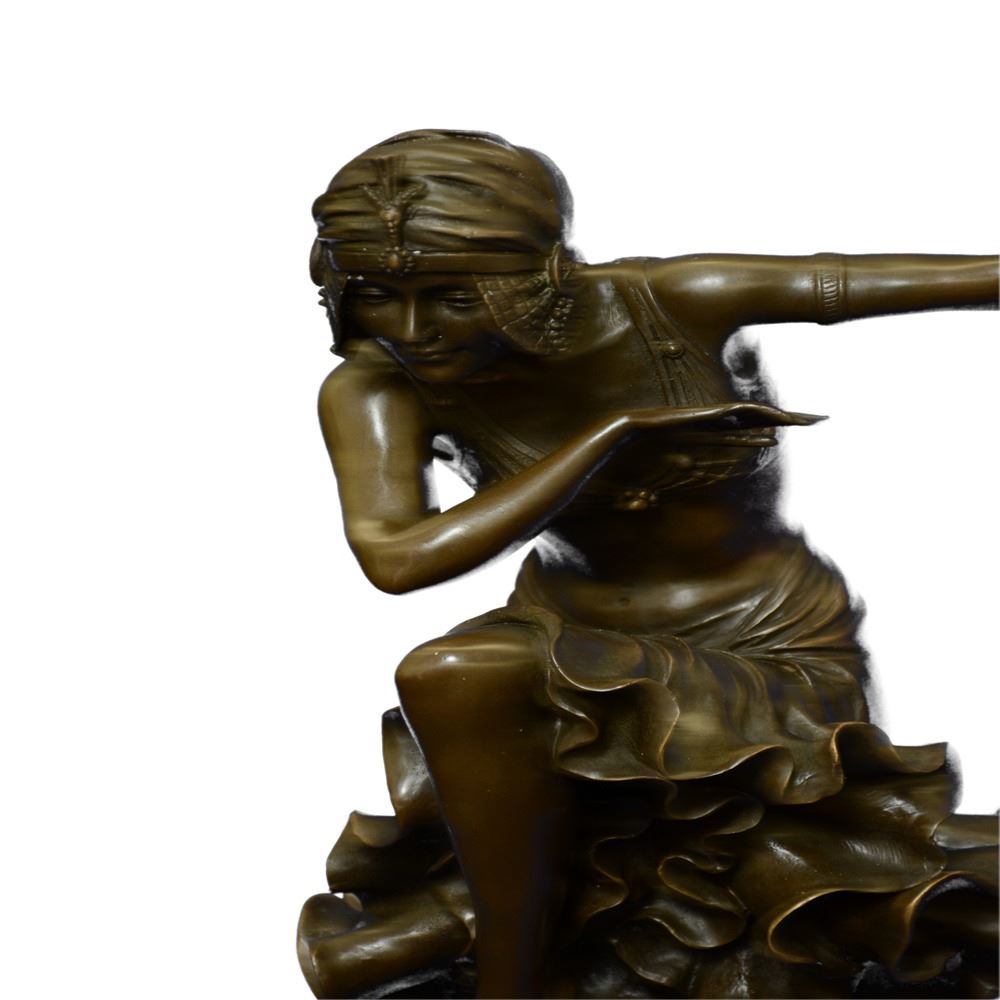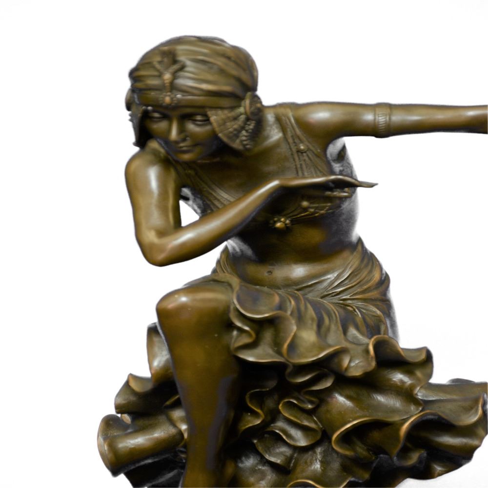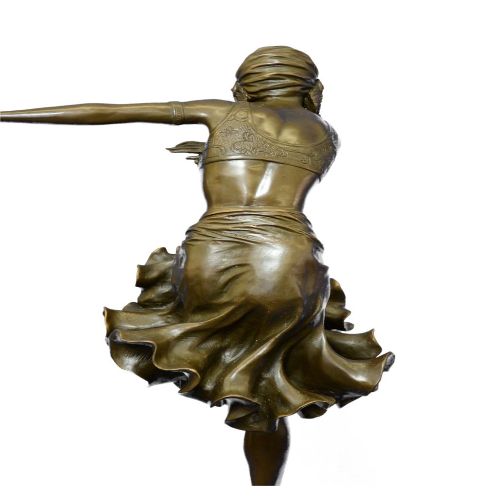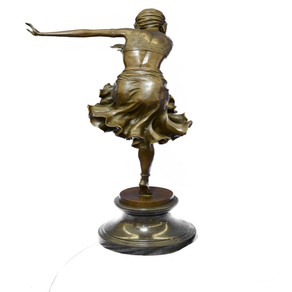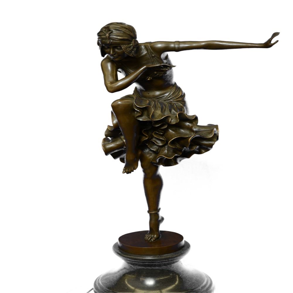 Brilliant showpiece of Art Deco Dancer on Marble base. Nice decoration wearing, the dancer wants to be the highlight of event. What a hot show: Woman knees down and bends forward. A fantastic Bronze art object, standing on a rectangular marble base. A valuable piece, fine decoration for every showroom. Designed in perfect details, madden of finest Bronze cast in museum quality. In comparison with the original, this Object is so filigree as possible. Bronze Dimensions with Marble Base: Height 27 X Width 11 inches. Weight: 33 LBS.