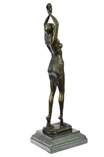 The Belly Dancer Presents Herself With Both Crossed Arms Above Her Head. She Tiptoes Forward Seductively, As The Beads Of Her Costume Jangle With Her Movement, Enticing Her Audience. She Was Captured Using The Age-Old Method Of Lost-Wax Casting And Stained With A Brown Patina For Preservation. The Bronze Sculpture Is Mounted Upon A Black Marble Base. Bronze dimensions with marble base: Height 17 X Width 5 inches. Weight: 8 lbs.Please Note: This is a reproduction bronze sculpture from the original molded and signed. This featured bronze sculpture is a recast after the original, and has been done recently. This 100% bronze sculpture is an abstract piece certain to be a conversation piece.Please Note: This is a reproduction bronze sculpture from the original molded and signed. This featured bronze sculpture is a recast after the original, and has been done recently. This 100% bronze sculpture is an abstract piece certain to be a conversation piece.