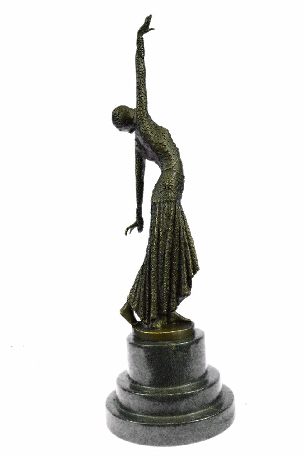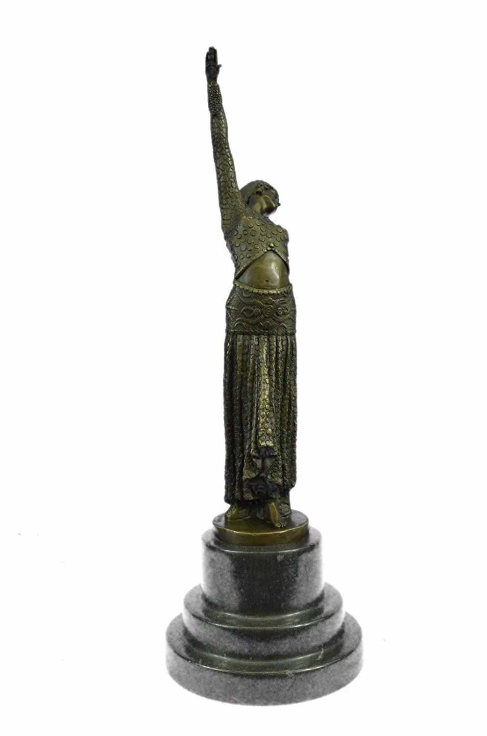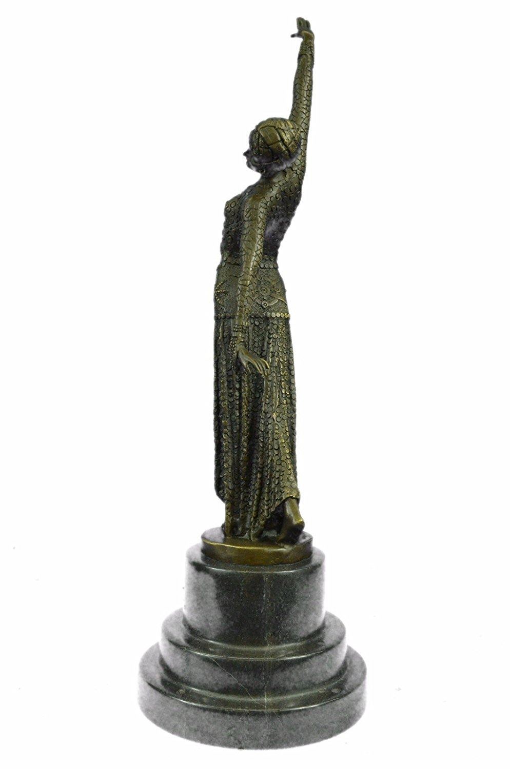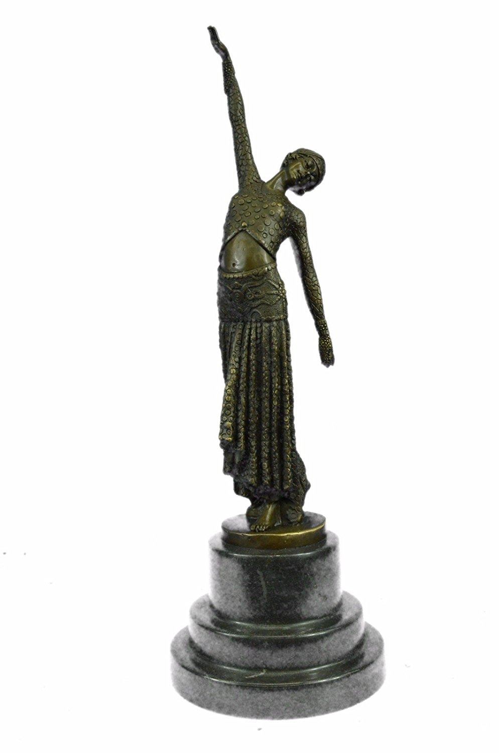 She stands center stage. Her body moves fluidly and her arms stretch elegantly, one extending to the sky and the other behind her. She arches her back, tilts her head to the side and gazes down to her feet. Her flat stomach peeks out from between her long flowing skirt and beaded floral bodice. A silk scarf is wrapped around her head neatly. 100% bronze and handmade, this sculpture was cast using the Lost Wax Method and mounted on a marble base. Bronze Dimensions with Marble Base: Height 15 X Width 8 inches. Weight: 8 LBS. Inventory: 64-B7153746