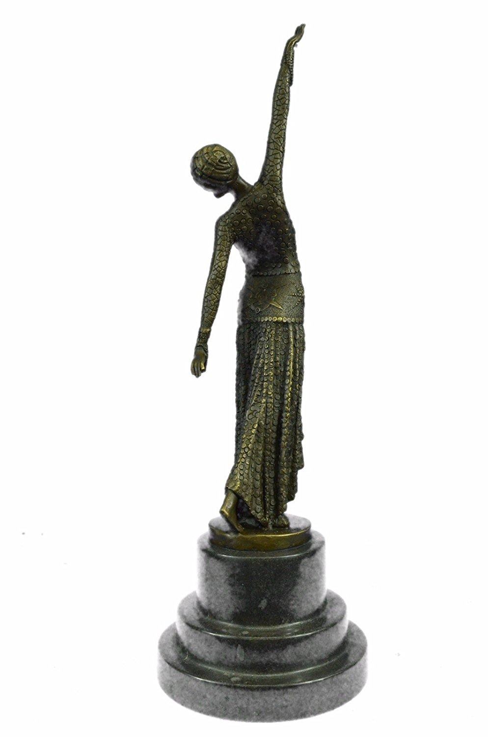 She stands center stage. Her body moves fluidly and her arms stretch elegantly, one extending to the sky and the other behind her. She arches her back, tilts her head to the side and gazes down to her feet. Her flat stomach peeks out from between her long flowing skirt and beaded floral bodice. A silk scarf is wrapped around her head neatly. 100% bronze and handmade, this sculpture was cast using the Lost Wax Method and mounted on a marble base. Bronze Dimensions with Marble Base: Height 15 X Width 8 inches. Weight: 8 LBS. Inventory: 64B7153746