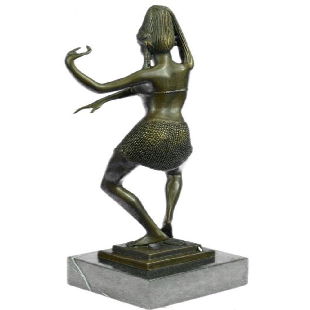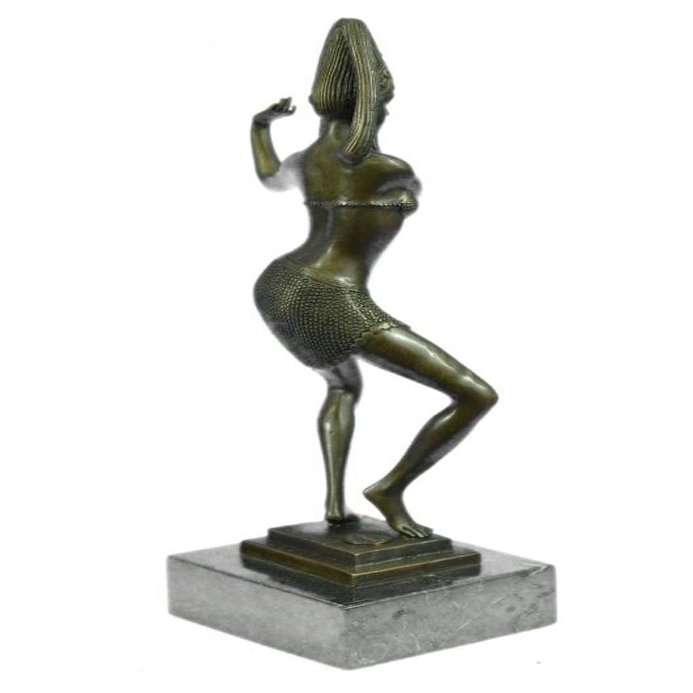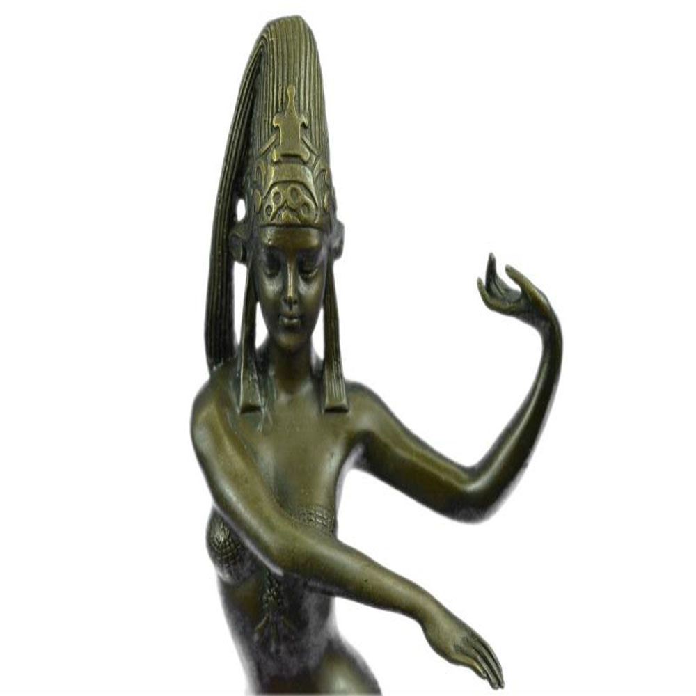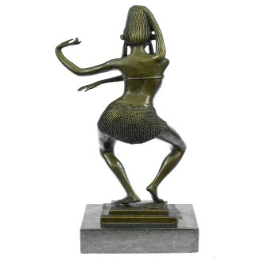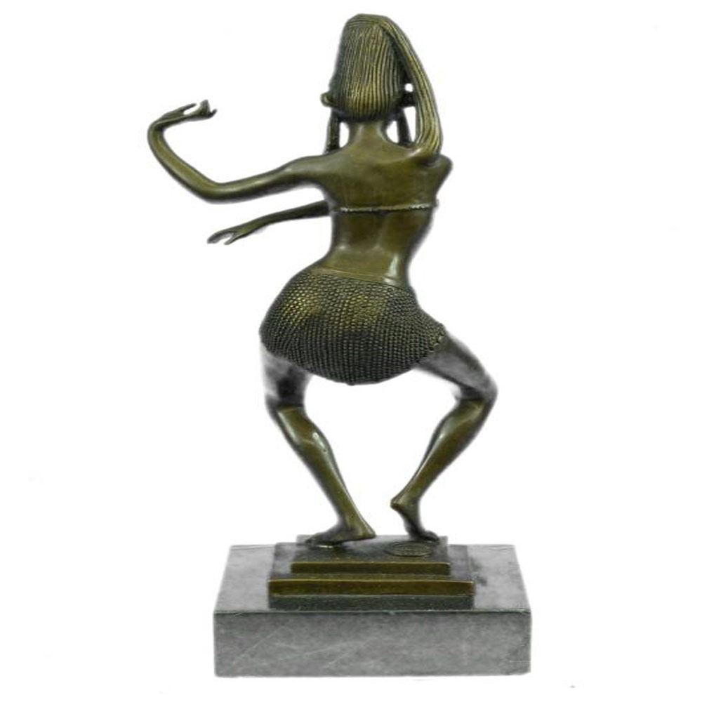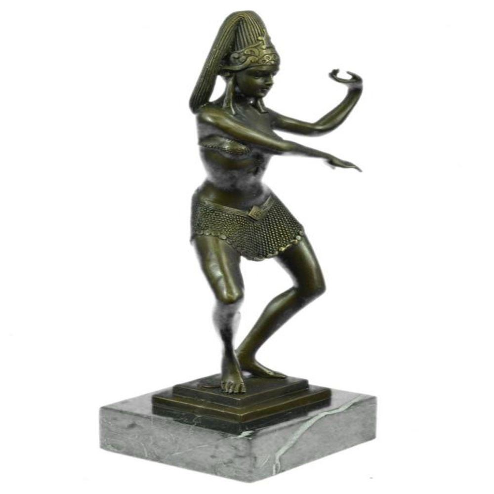 The Egyptian dancer presents herself with both crossed arms on her side. She tiptoes forward seductively, as she is wearing a seductive costume, enticing her audience. She was captured using the age old method of lost wax casting and stained with a brown patina for preservation. The Bronze Sculpture is mounted upon a marble base. Bronze Dimensions with Marble Base: Height 11 X Width 4 inches. Weight: 6 LBS.