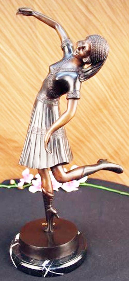 This Graceful Bronze Dancer Is Exquisitely Complete With Egyptian Symbols Reflecting The Period'S Fascination With The Excavation Of Tutankhamen'S Tomb. The Base Forms A Natural Pairing To The Sculpture Becoming Part Of The Design And Form. She Wears A Headdress Of Extravagant Metal And Jewels. She Wears A Top With Little Beads On The Edge Of The Shirt, Exposing Her Naked Torso, And The Most Beautifully Detailed Skirt. The Skirt Falls Long To Her Knees, She Wears A Scarf Type Cover Up For Her Head And Nice Calve High Boots.100% bronze sculpture, this brown patina sculpture was cast using the "lost wax method" and mounted on a black marble base. This sculpture is very interesting a bronze recast based on the original piece. Bronze Dimensions With Marble Base: Height 22" X Width 16". Weight : 15 Lbs.