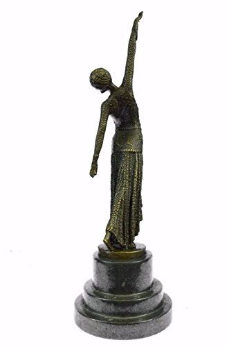 With Grace, Agility And Flexibility, She Stands Center Stage. Her Body Moves Fluidly And Her Arms Stretch Elegantly, One Extending To The Sky And The Other Behind Her. She Arches Her Back, Tilts Her Head To The Side And Gazes Down To Her Feet. Her Flat Stomach Peeks Out From Between Her Long Flowing Skirt And Beaded Floral Bodice. A Silk Scarf Is Wrapped Around Her Head Neatly. This Sculpture Was Cast Using The Lost Wax Method And Mounted On A Marble Base. Bronze dimensions with marble base: Height 15 X Width 8 inches. Weight: 8 lbs.Please Note: This is a reproduction bronze sculpture from the original molded and signed. This featured bronze sculpture is a recast after the original, and has been done recently. This 100% bronze sculpture is an abstract piece certain to be a conversation piece.Please Note: This is a reproduction bronze sculpture from the original molded and signed. This featured bronze sculpture is a recast after the original, and has been done recently. This 100% bronze sculpture is an abstract piece certain to be a conversation piece.