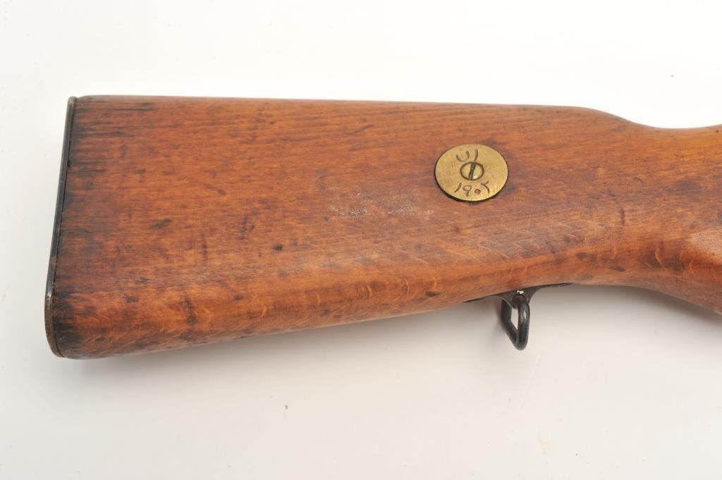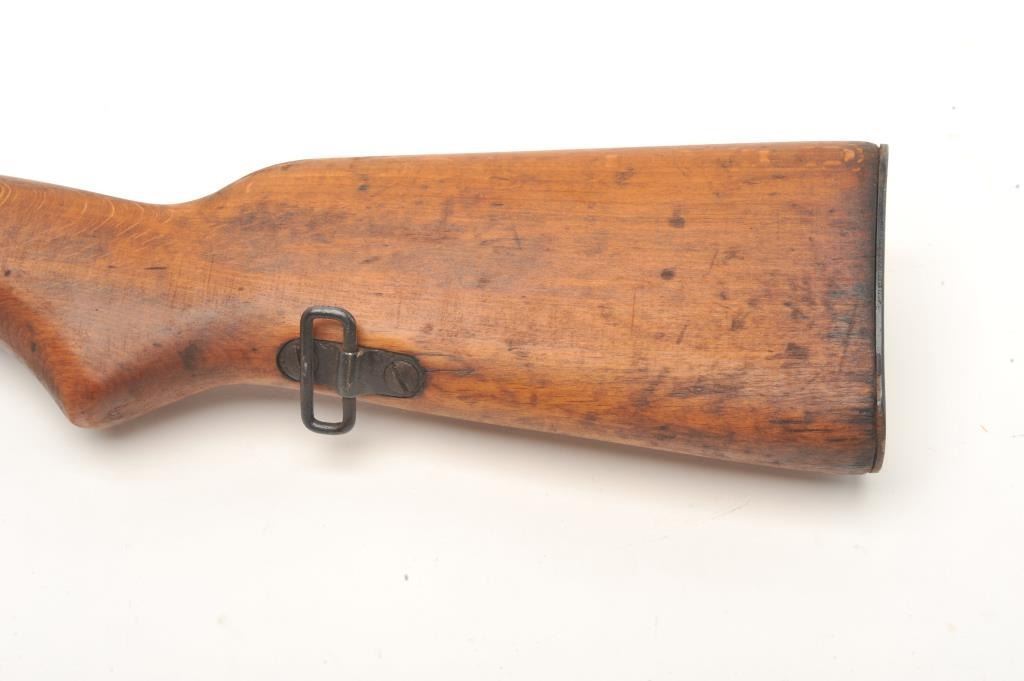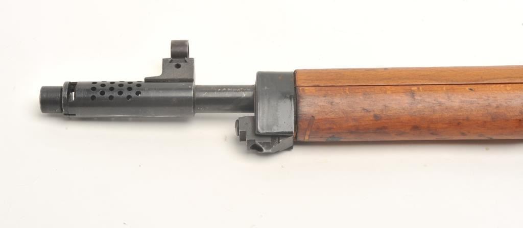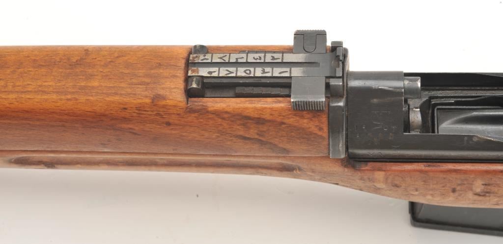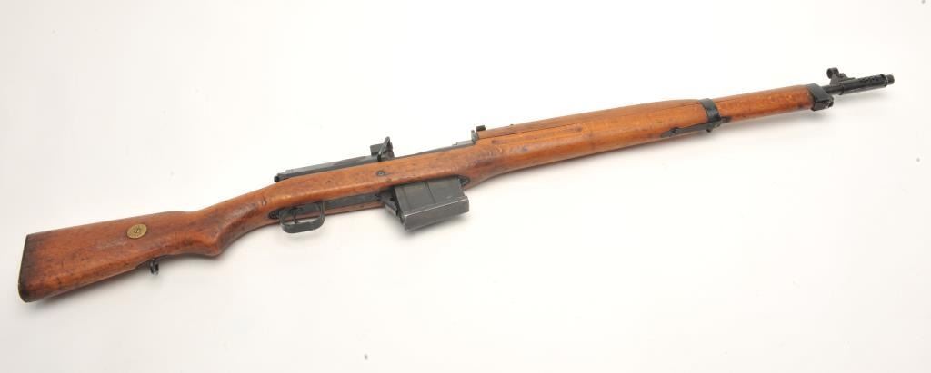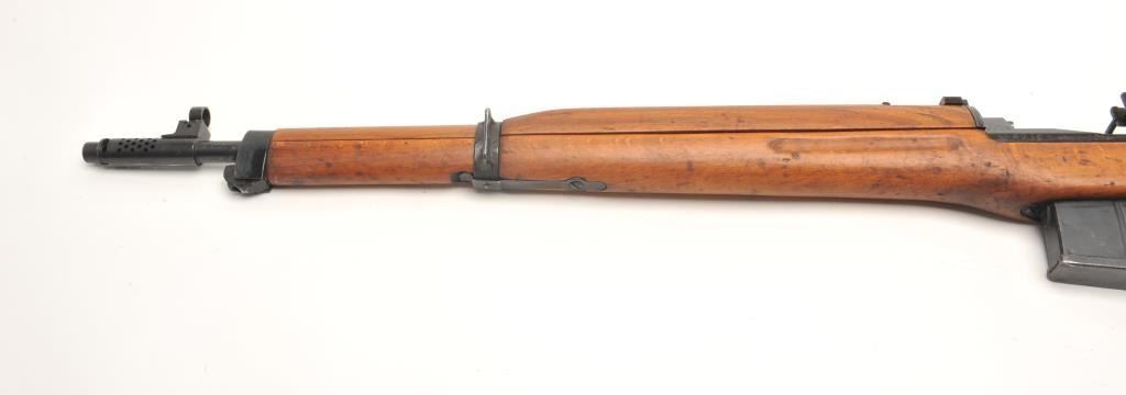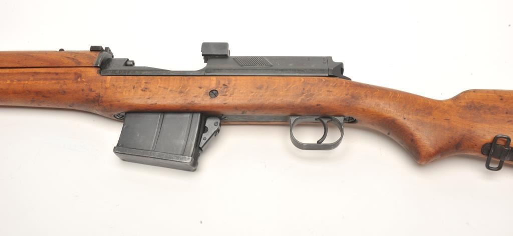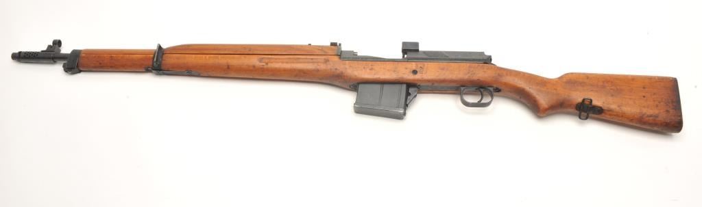 Egyptian Hakim semi-auto rifle, 8mm caliber, serial #9218. The rifle is in good overall condition with a 25” import marked barrel including the muzzle break. The barrel and receiver retain the majority of theirmilitary finish with wear and handling marks consistent with service use. The receiver is marked made in Egypt. The Hakim is based on the design of the Swedish AG42B Ljungman, with the Hakim chambered for the 8 x 57Mauser round. The smooth wood stock is in good condition with storage wear, sling swivels and a smooth steel butt plate. The bore is good, the action crisp and markings are sharp on desirable Hakim. The lotincludes one correct magazine. (C+R) Est.: $500-$1,000.