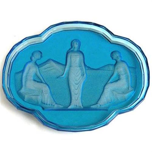 From the vanity set known as ?Egyptian? this fabulous turquoise colored blue Art Deco vanity tray was produced in Bohemia during the 1930s and features an intaglio image of three young ladies posing in front of desert sand dunes. With a scalloped rim and gorgeous shape it measures 10 ½? x 9? and is in excellent condition.