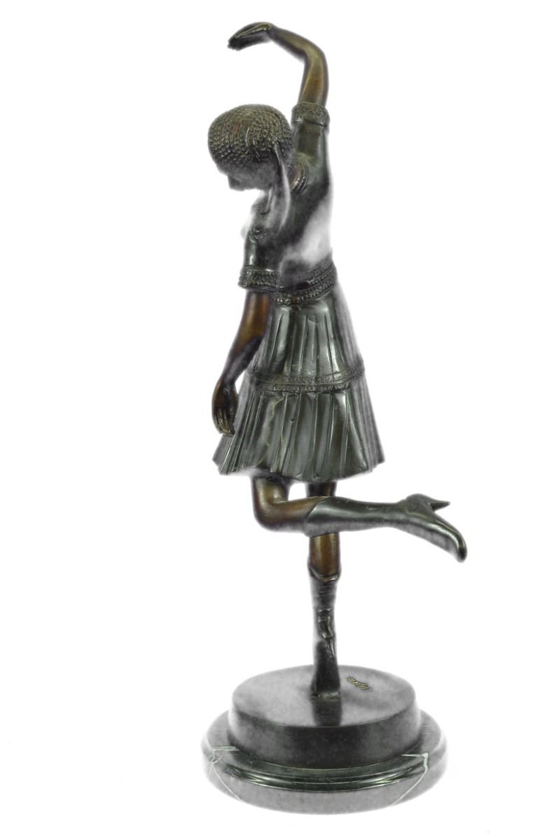 This graceful bronze dancer is exquisitely handmade complete with Egyptian symbols reflecting the period's fascination with the excavation of Tutankhamen's tomb. The base forms a natural pairing to the sculpture becoming part of the design and form. She wears a headdress of extravagant metal and jewels. She wears a top with little beads on the edge of the shirt, exposing her naked torso, and the most beautifully detailed skirt. The skirt falls long to her knees, she wears a scarf type cover up for her head and nice calve high boots. Handmade of 100% bronze and cast using the ancient Lost Wax Method. Two tone patina finish on a solid black marble base. Bronze Dimensions with Marble Base: Height 22 X Width 16 inches. Weight: 15 LBS. Inventory: 1457546M6541