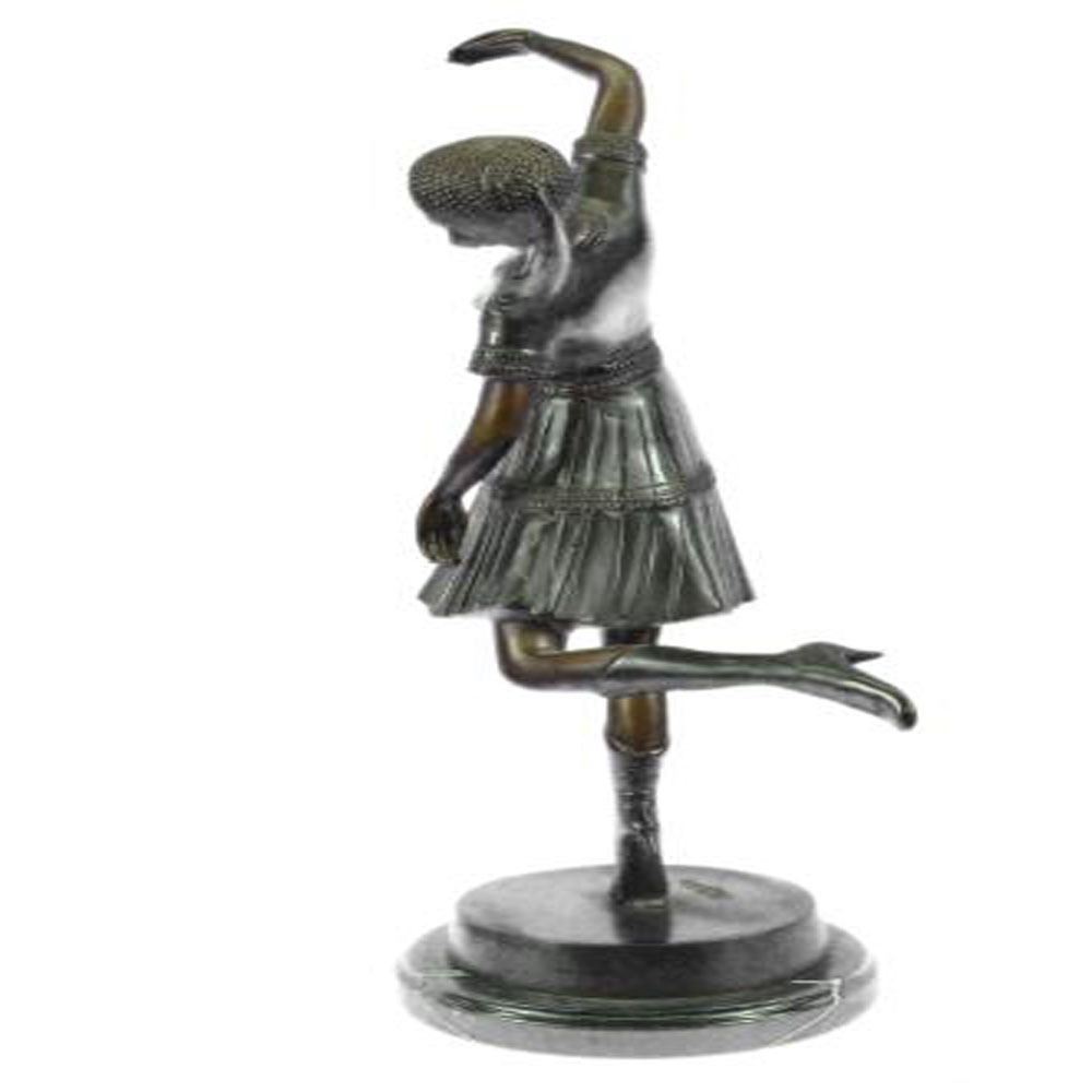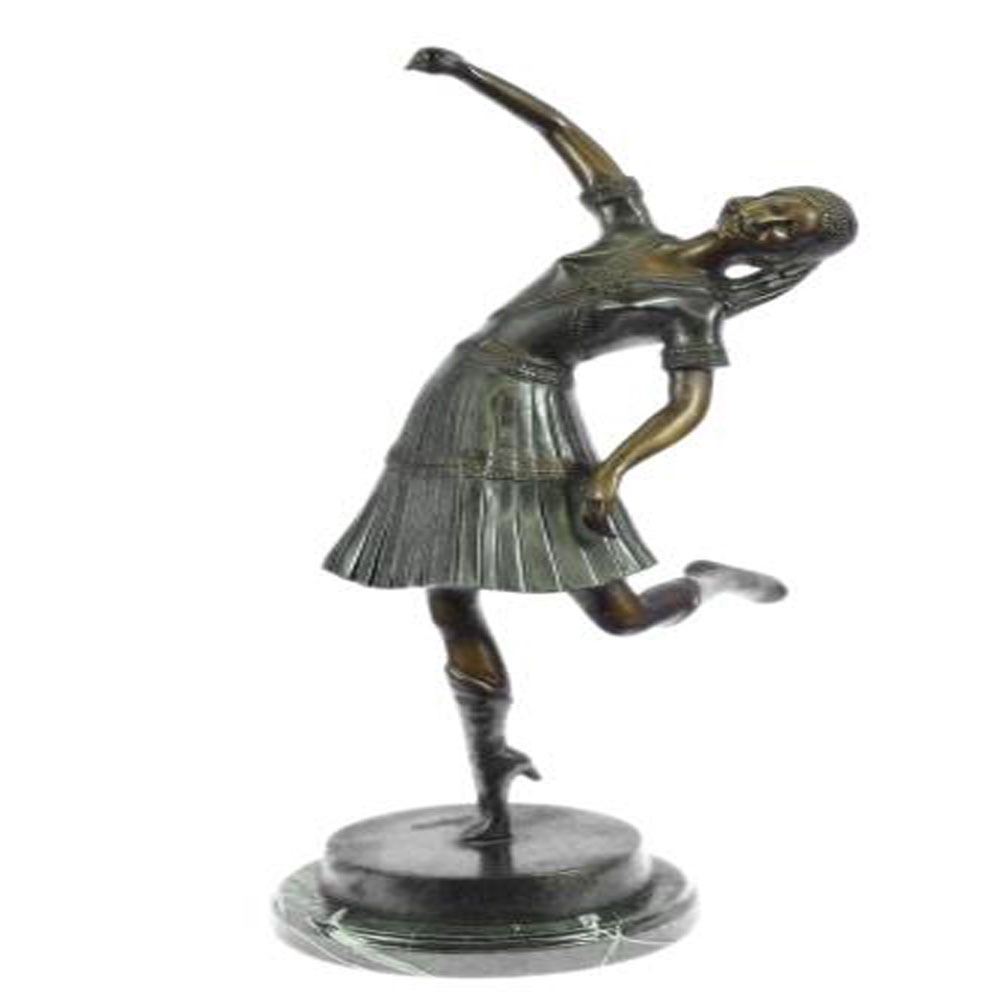 This graceful Bronze dancer is exquisitely handmade complete with Egyptian symbols reflecting the periods fascination with the excavation of Tutankhamens tomb. The base forms a natural pairing to the Sculpture becoming part of the design and form. She wears a headdress of extravagant metal and jewels. She wears a top with little beads on the edge of the shirt, exposing her naked torso, and the most beautifully detailed skirt. The skirt falls long to her knees, she wears a scarf type cover up for her head and nice calve high boots. Handmade of 100% Bronze and cast using the ancient Lost Wax Method. Two tone patina finish on a marble base. Bronze Dimensions with Marble Base: Height 22 X Width 16 inches. Weight: 15 LBS.