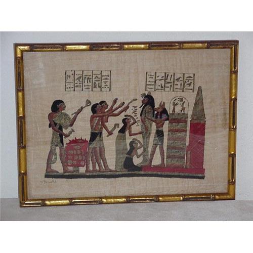 An Egyptian scene of a mummy being prepared for the after life by priest and attends,18" X 13", gold leaf bamboo style frame. Painted on what appears to be parchment paper. (3)
