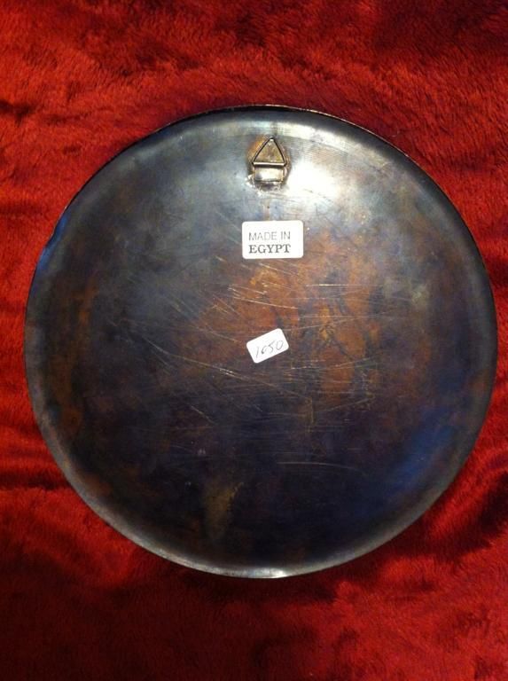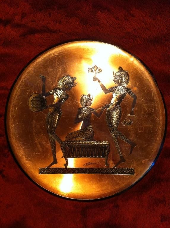 An 8" copper plate that has been skillfully etched showing three Egyptian ladies dancing and playing their instruments. It has a date of 1992 etched onto the front of the plate. This copper plate was made in Egypt.