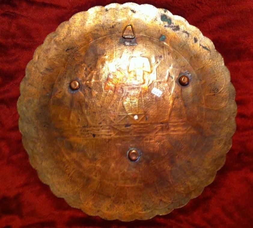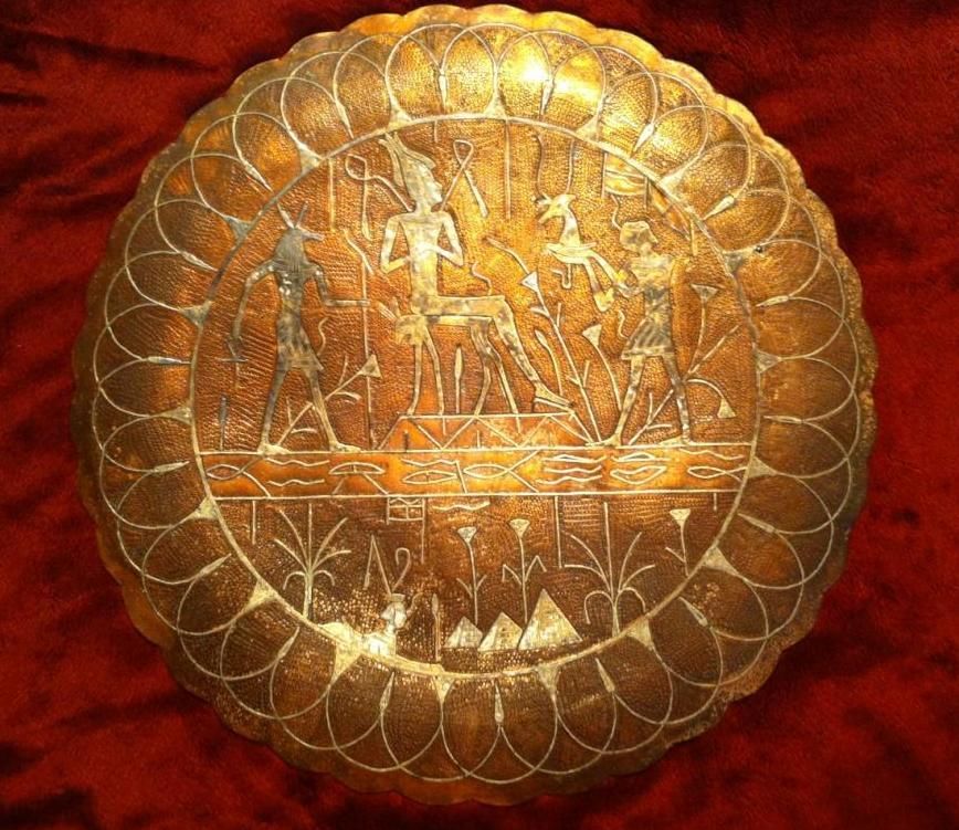 This solid copper platter is hand made and nickel edged depicting a scene of an offering to the Pharoah. The diameter of the plate is 13 7/8" with a scallop edge. The entire plate has symbols and architectural designs of Eqypt. This platter has been altered in the back to be able to hang from the wall.