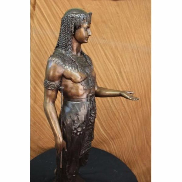 A very nice, big sculpture, this Art Deco Bronze Egyptian prince on Marble Base. Relaxed a young prince  stand in royal palace. In casual upright pose. Well dressed, elegantly clothes  and a slim headband cares her sweet body. The sculpture, made of finest bronze  material, casted in our foundry in an amazing agreement to the original. Artist  signed at the side of bronze socket. Below a square, layered marble base. A true  detailed museum bronze cast, a focal point in every exhibition. Bronze Dimensions with Marble Base: Height 35 X Width 11 inches. Weight: 43  LBS. Please Note: This is a reproduced bronze sculpture from the original molded and signed. This featured bronze sculpture is a recast after the original, and has been done recently. This 100% bronze sculpture is an abstract piece certain to be a conversation piece.
