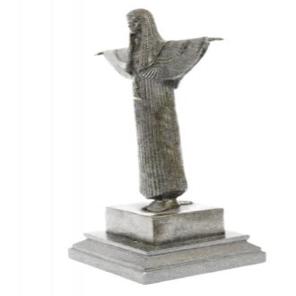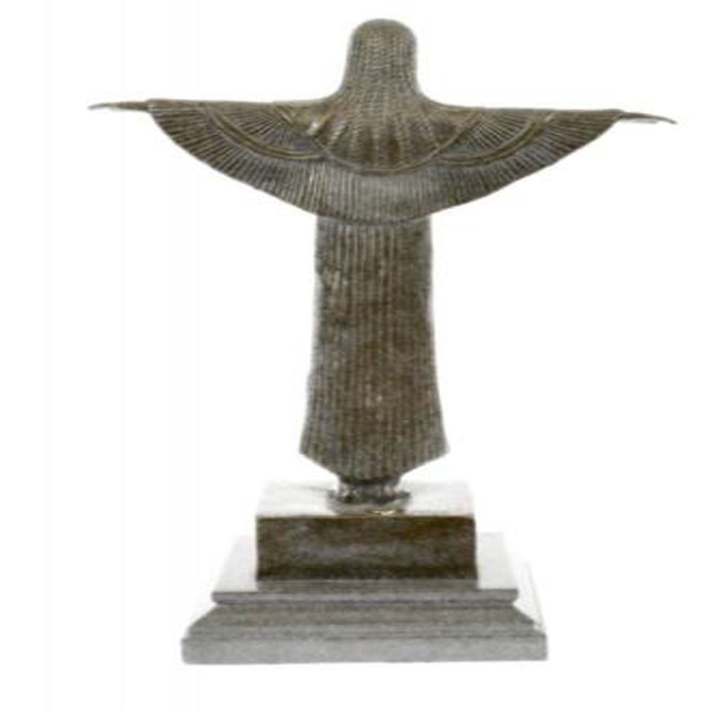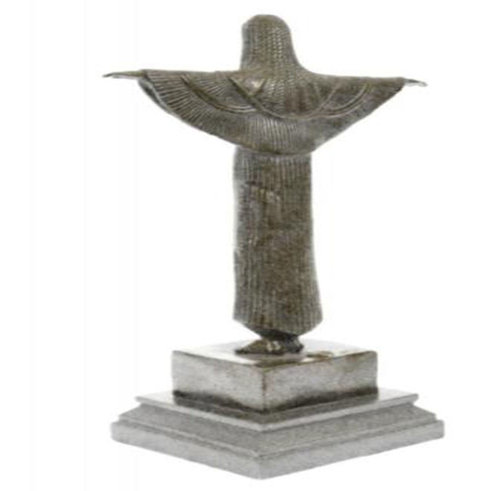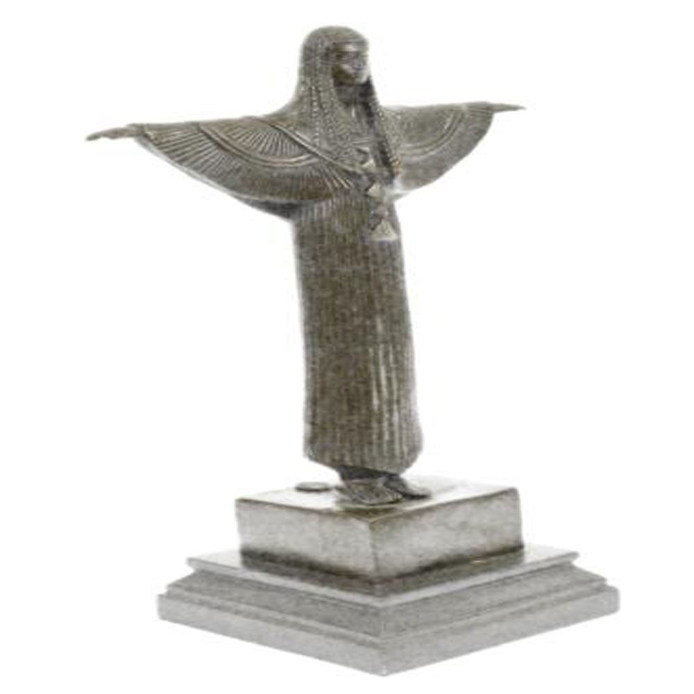 This is a beautiful Sculpture of an Egyptian woman dancer. Her feet and legs placed together and her arms stretched out and she has on an intricately elaborated head garment. She stand still and straight without even a smile upon her face, she had this beautiful dress that covers her whole body from head to toe. The dress has a shoulder cover that seems to be attached to her headpiece but it is not and it extends out giving it a look of wings under her arms as she stretches her arms. This amazing Sculpture got fantastic details on every part of it from the dress to the headpiece to her facial expression. This is a beautiful Bronze Sculpture cast using the Lost Wax Method and has a gorgeous brown patina and it is mounted on a marble base. Dimensions: Height 14 X Width 9 inches. Weight: 10 LBS.